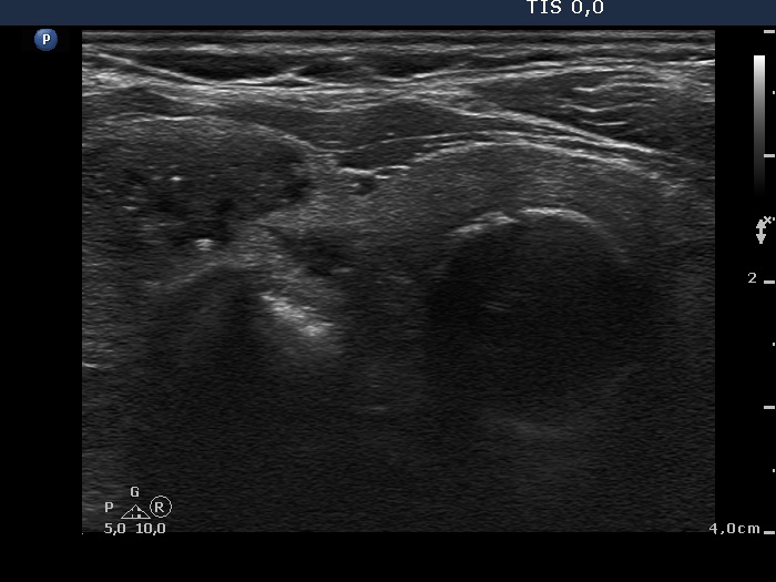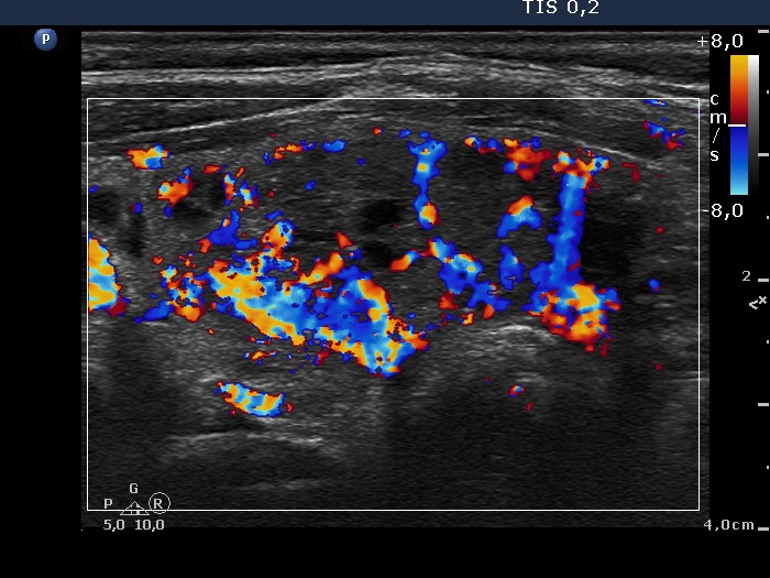 Ultrasonography. The thyroids were composed of multiple nodules with different echogenicities. The lesion presented various forms of intranodular hyperechogenic figures, including microcalcifications. Despite the presence of the latter, neither of the lesions were suspicious, they presented regular and sharp borders. increased intranodular blood flow.