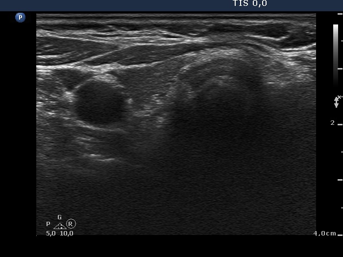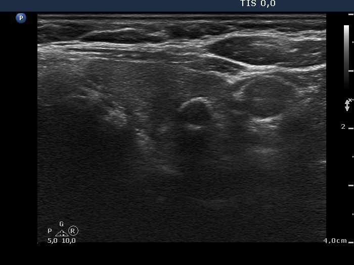 Comment. The non-nodular part of the thyroid was hypoechogenic. It would be almost diagnostic for autoimmune thyroiditis in a younger patient, however in elderly even such degree of hypoechogenicity may be a normal finding.