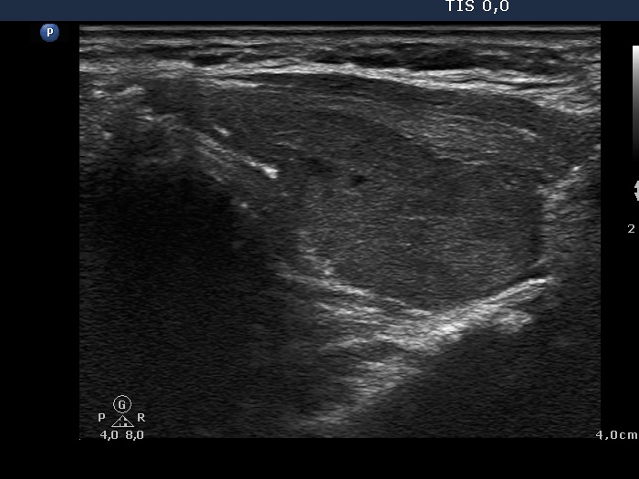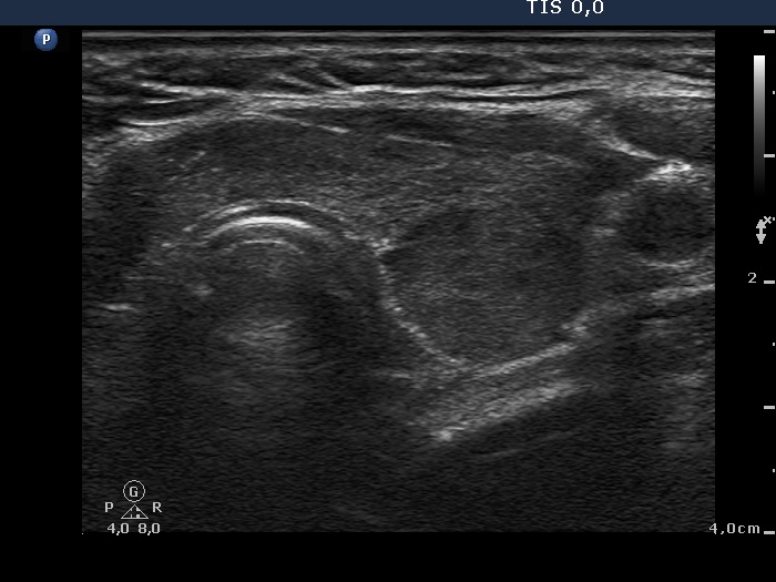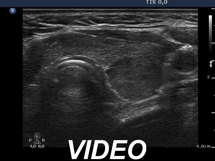 Comment: the shape of a nodule is egg- or ball-shaped. A pipe-shaped formation like a vessel or muscle fiber or as in this case a large area of the thyroid with different echo structures may mimic a nodule. But in the latter cases if we put the transducer in line with the formation we can notice the pipe-like shape. Conversely, if we put the transducer in other angles, first of all perpendicular to the object then it seems to be a nodule.