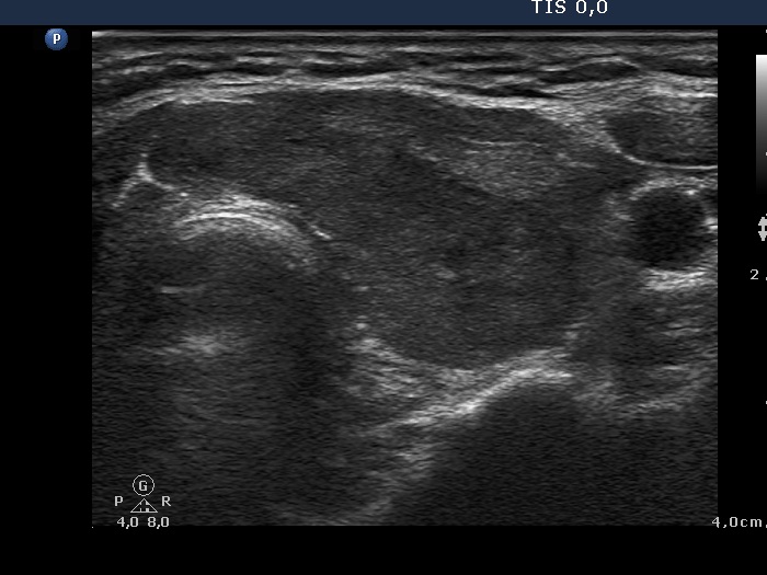 Ultrasonography: the thyroids were moderately hypoechogenic. The dorsal 4/5 of the left lobe was more hypoechogenic. This hypoechogenic area could be followed all along the dorsal part of the left lobe and the isthmus.
