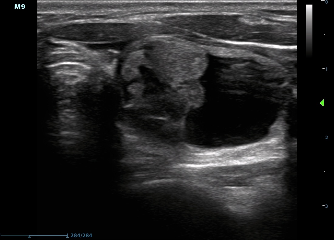 In many instances we cannot clearly categorize a cystic nodule. This nodule presents sings of a spongiform and an eccentric type cyst. Although elastography has no relevance in the event of a cystic nodule, the image demonstrates that the solid part is hard (blue) while the cystic part is soft (green and red).