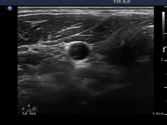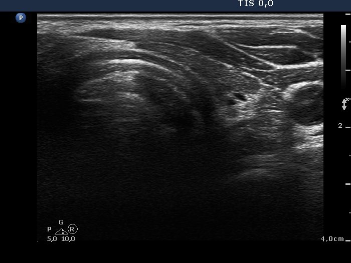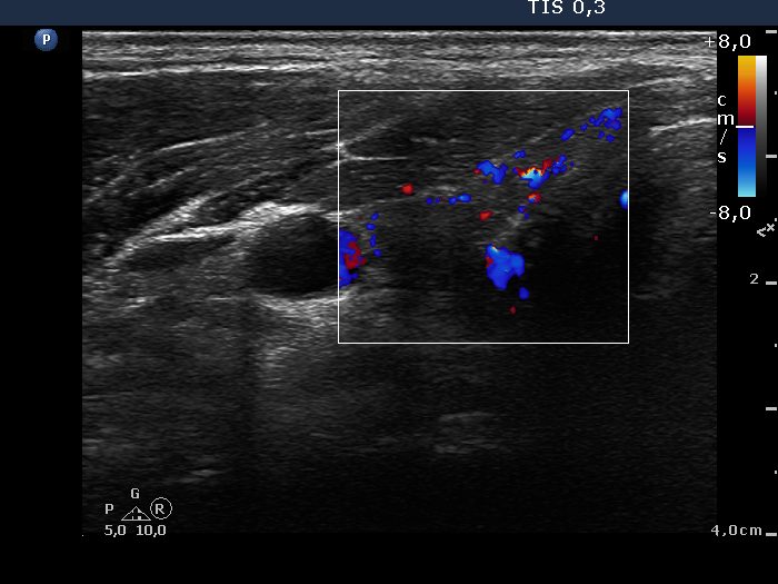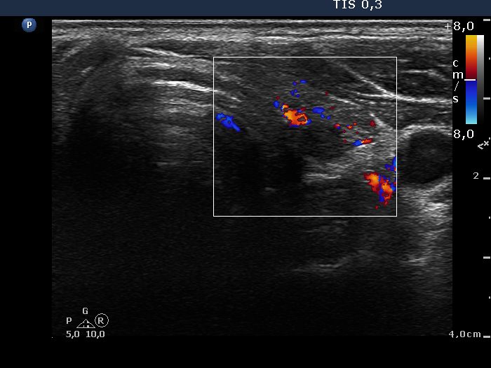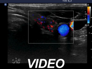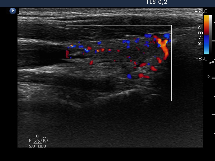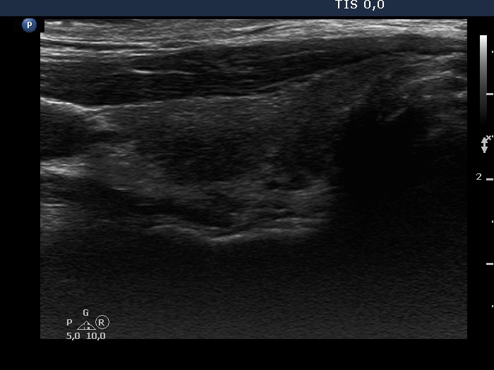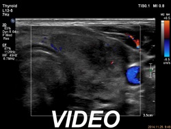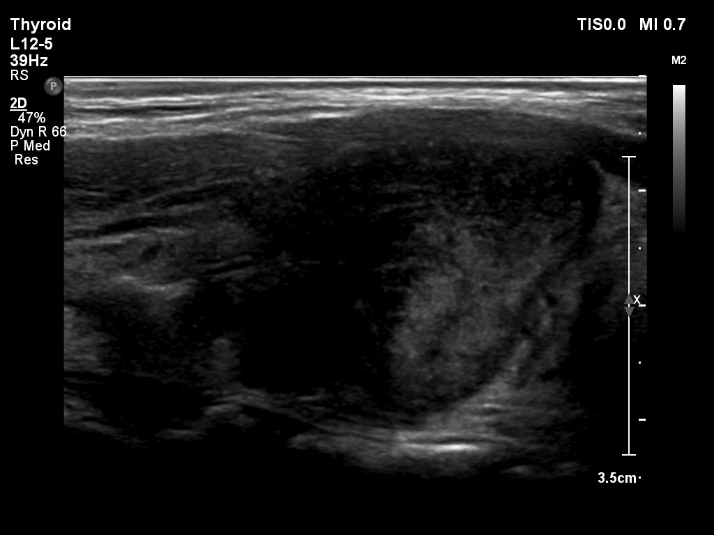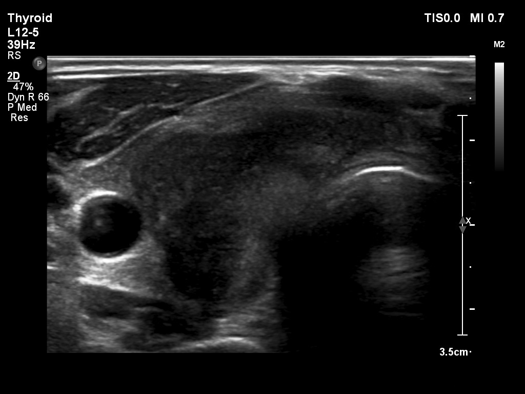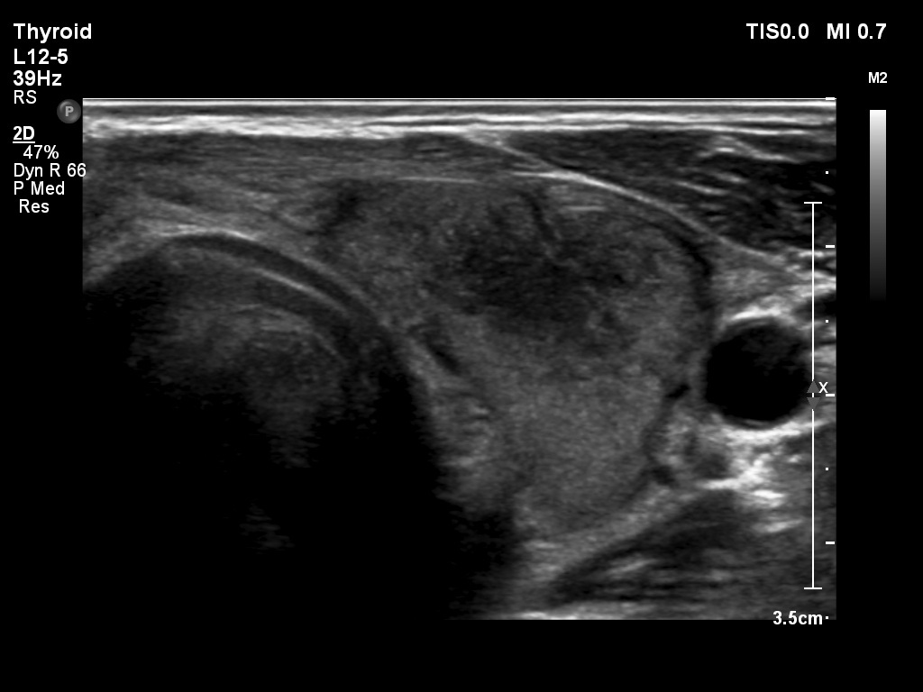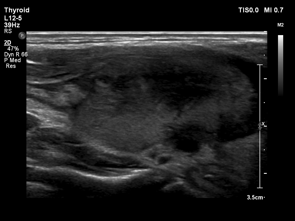 There were several unusual findings in this patient. First, the thyroid contained severely hypoechogenic areas and the borders of the hypoechogenic areas were rather puzzle-like than ill-defined. The latter increased the possibility of a concomitant autoimmune thyroiditis.