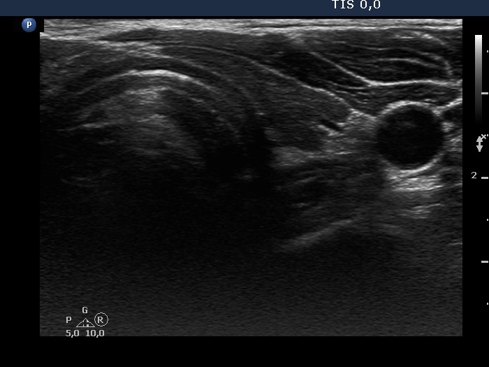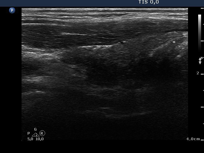Ultrasonography: The size of the thyroid decreased dramatically and became atrophic. The right lobe still presented a small deeply hypoechogenic area. In contrast with the first examination, the basic echo structure of the left lobe was not normal but moderately hypoechogenic. The vascularization was decreased and average, right and left lobe, respectively.