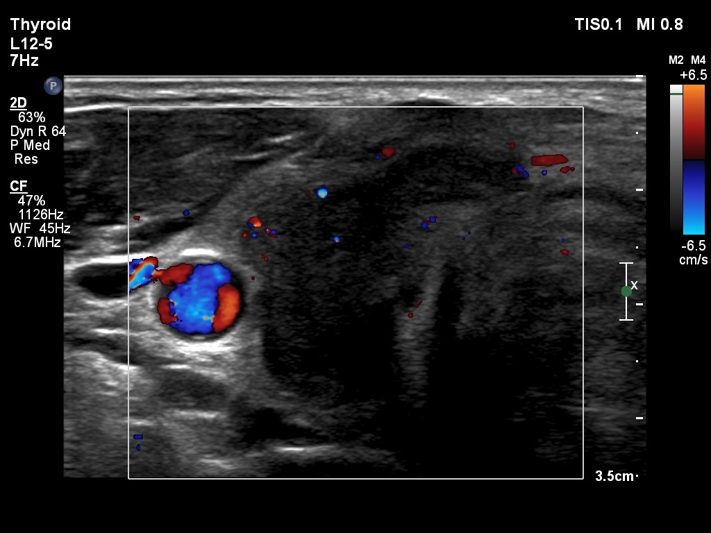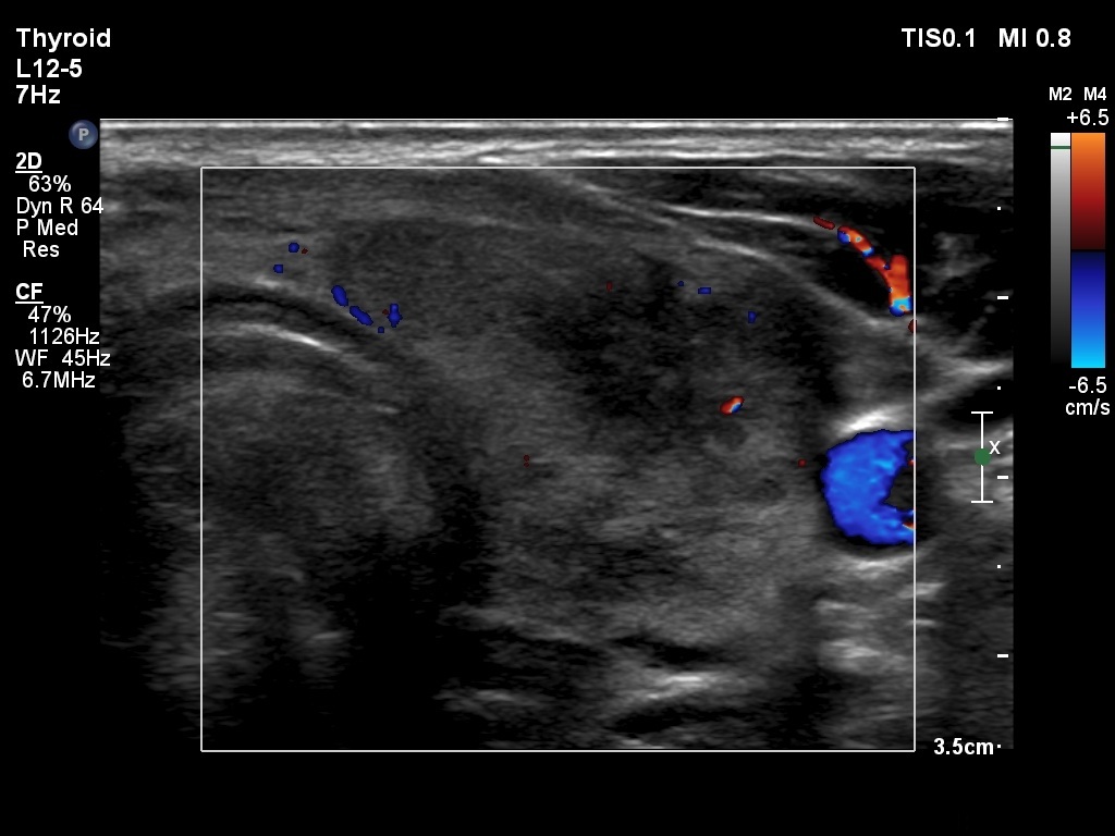 Ultrasonography: Both lobes presented hypoechogenic ill-defined areas. The echogenicity index was 80% in the right lobe while 20% in the left thyroid. The vascularization was significantly decreased.
