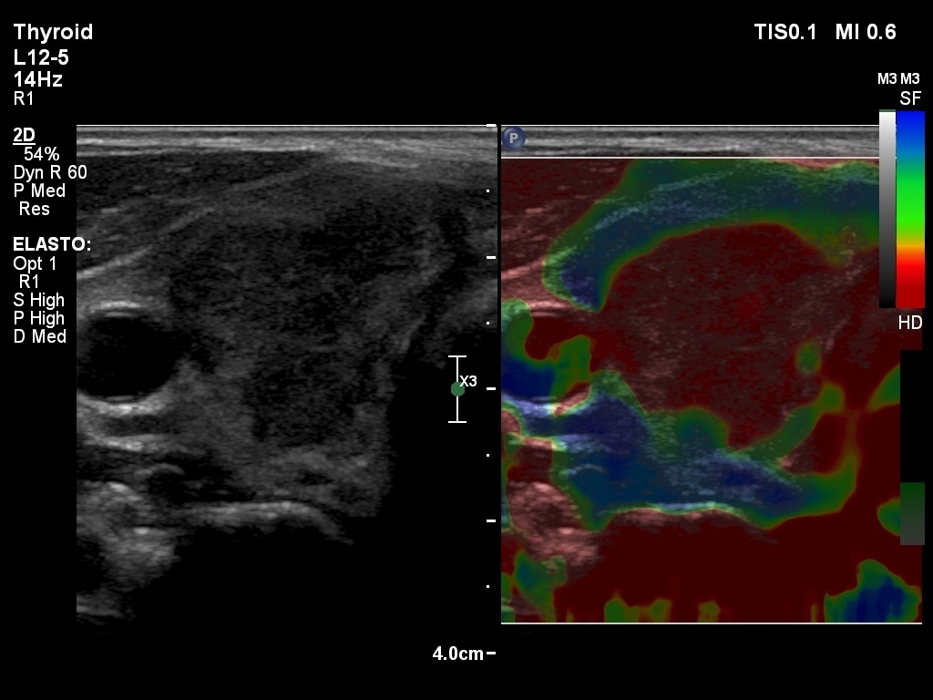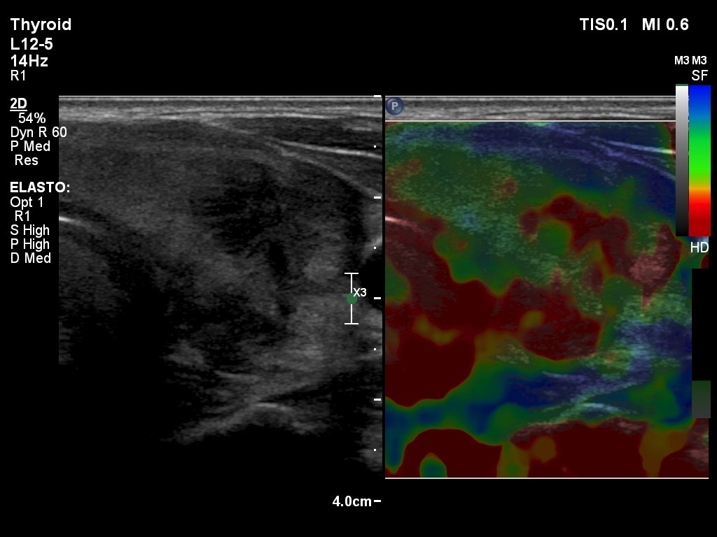 Elastography demonstrated hard areas according to the hypoechogenic field in the left lobe while almost the entire right lobe proved to be hard.Cytological diagnosis: subacute, granulomatous de Quervain's thyroiditis.