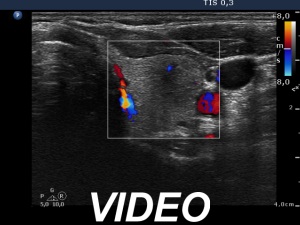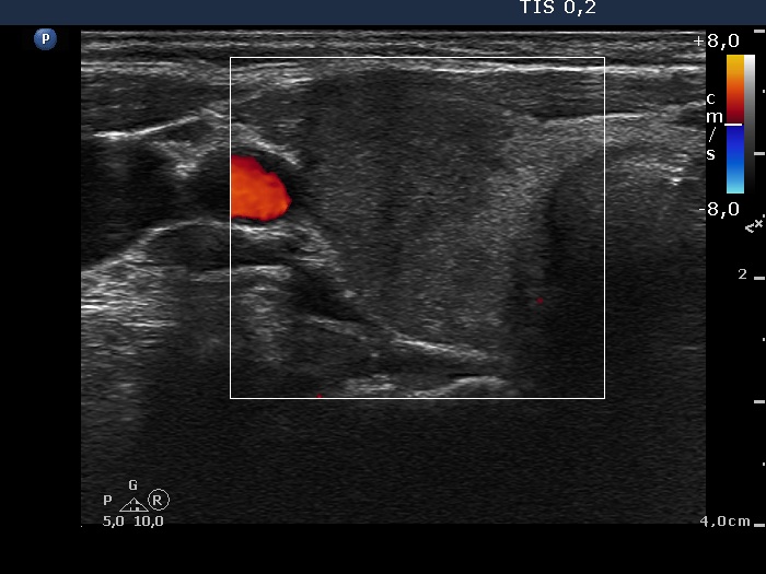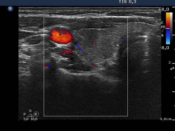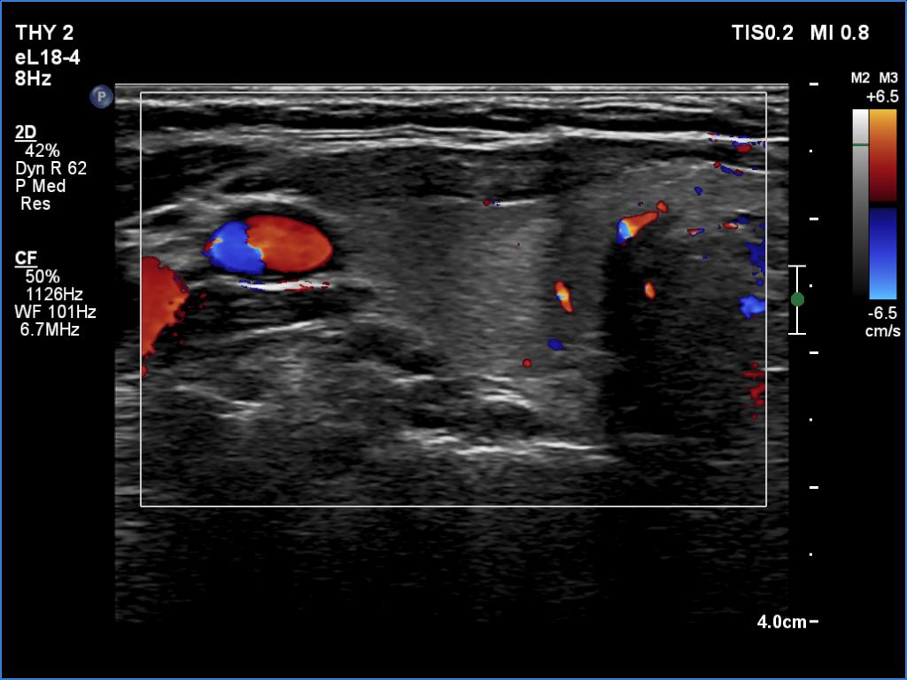 Ultrasonography: The thyroid presented with hypoechoic areas which had blurred borders. The echogenicity index was approximately 65% in the right and 20% in the left lobe. The thyroid was almost completely avascular.