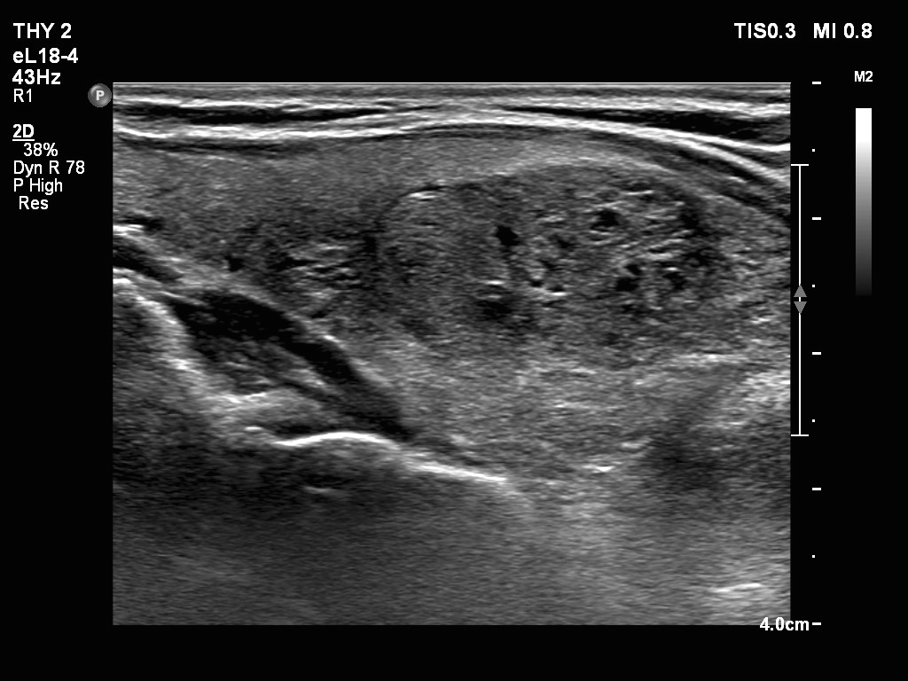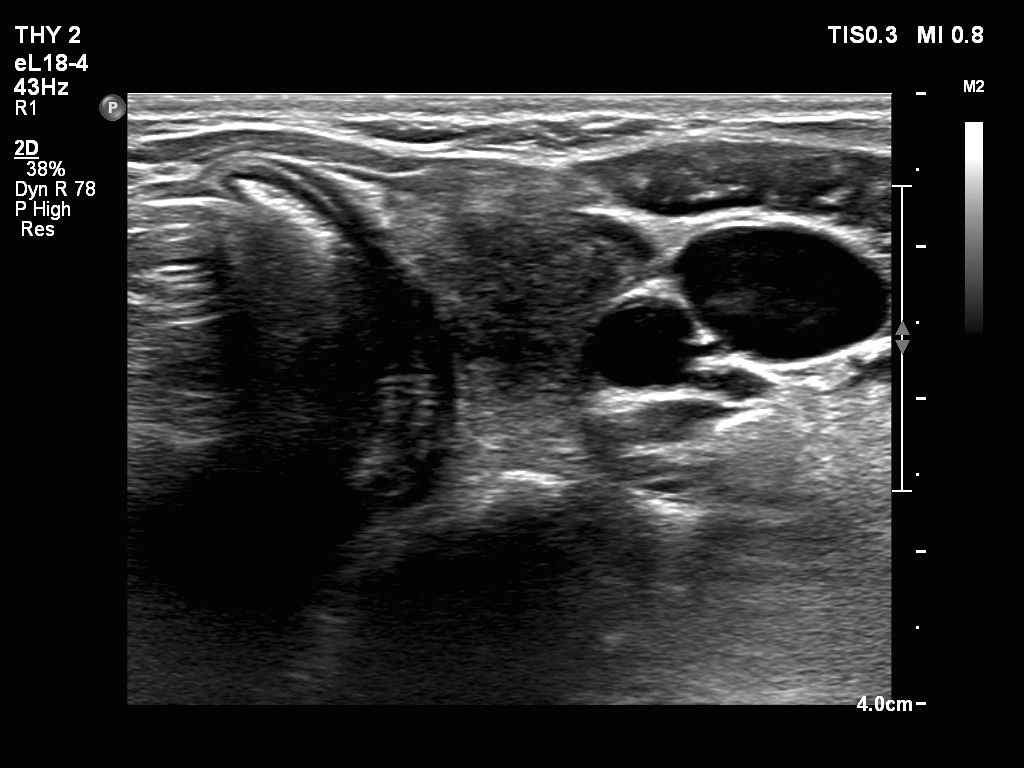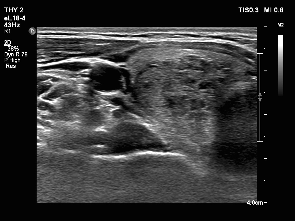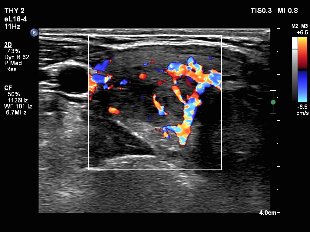 Ultrasonography. The thyroid was echonormal. There were two nodules in the right lobe. The upper was hyperechogenic-cystic while the lower was a minimally-moderately hypoechogenic. The latter had irregular, lobulated margins. There was a hypoechoic area in the upper two-third of left lobe. The discrete area presented ill-defined margins and decreased vascularization. A spongiform cyst was found in the lower pole of the left lobe.