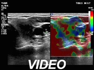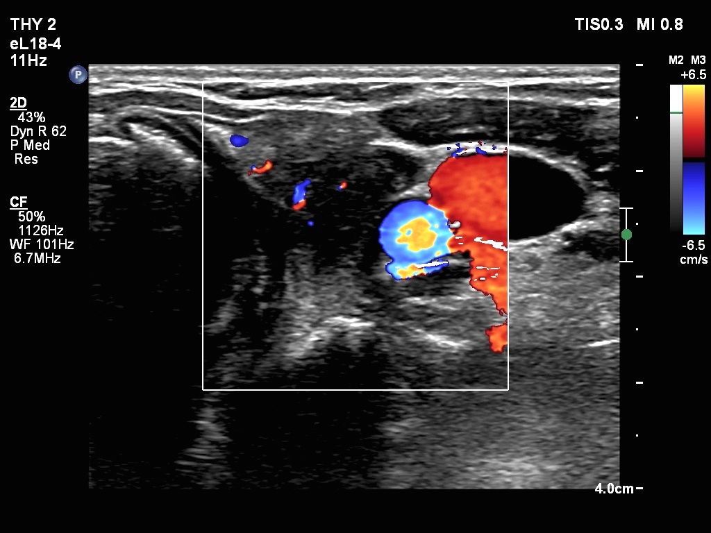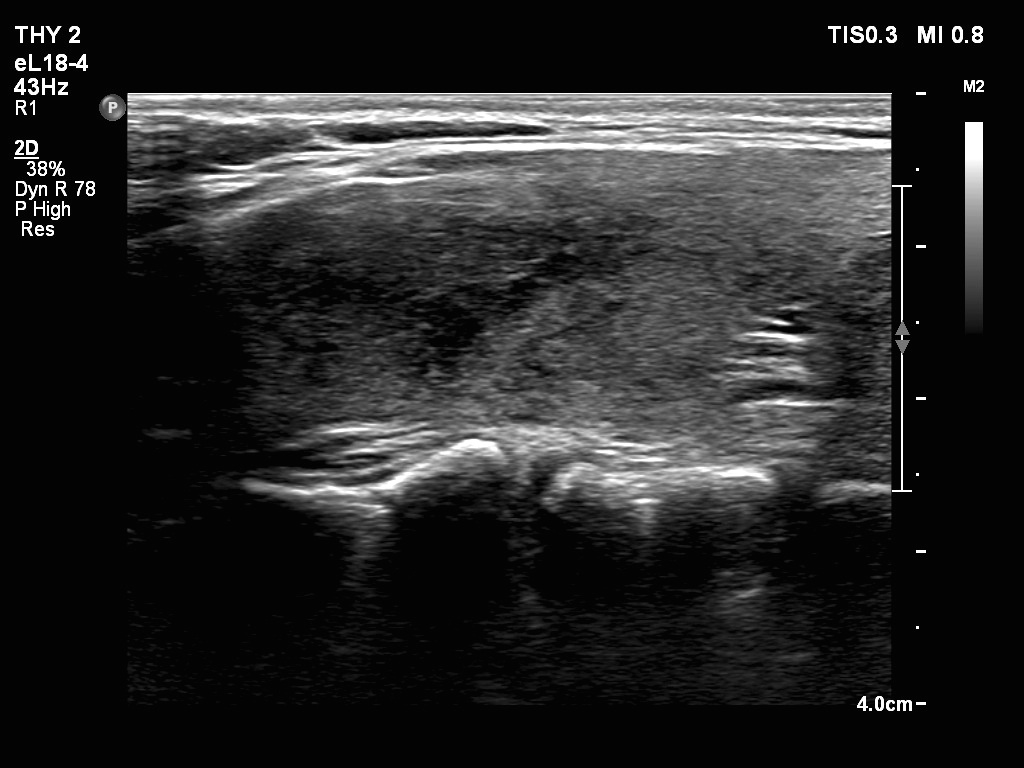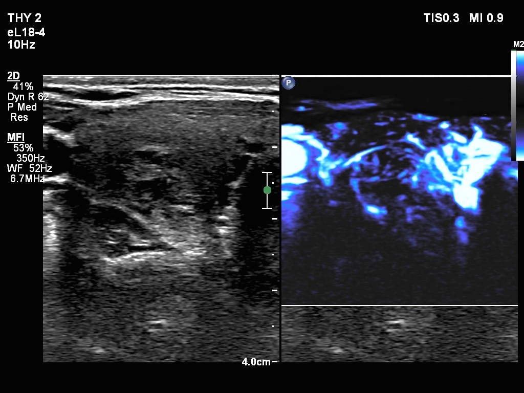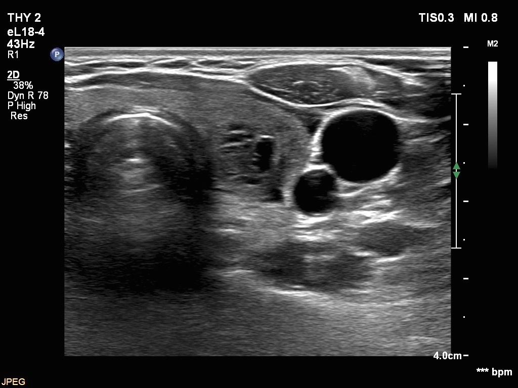 Ultrasonography. The thyroid was echonormal. There were two nodules in the right lobe. The upper was hyperechogenic-cystic while the lower was a minimally-moderately hypoechogenic. The latter had irregular, lobulated margins. There was a hypoechoic area in the upper two-third of left lobe. The discrete area presented ill-defined margins and decreased vascularization. A spongiform cyst was found in the lower pole of the left lobe.