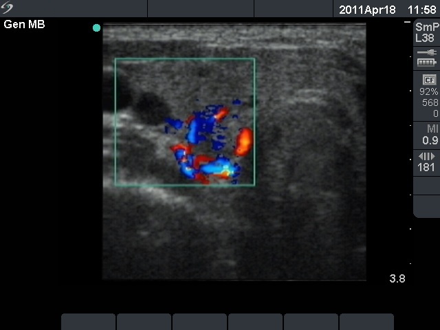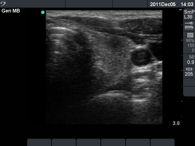 Ultrasonography: The right thyroid was echonormal and contained several small, insignificant lesions. There was a hypoechogenic lesion with blurred borders in the central and in the ventro-medial part of the left thyroid with increased intranodular blood flow.