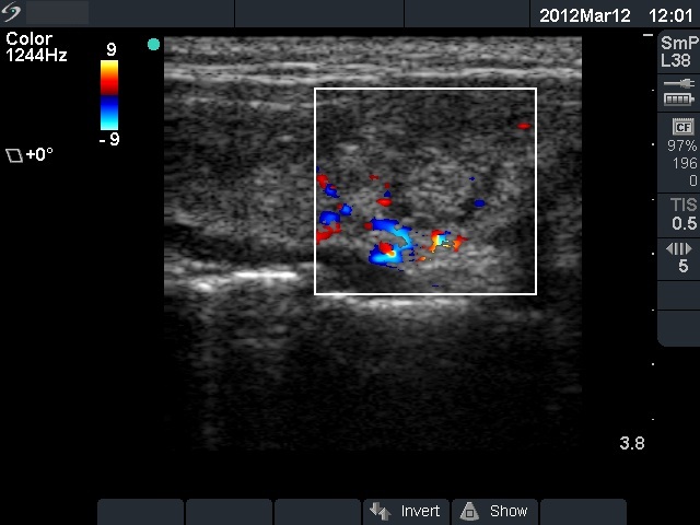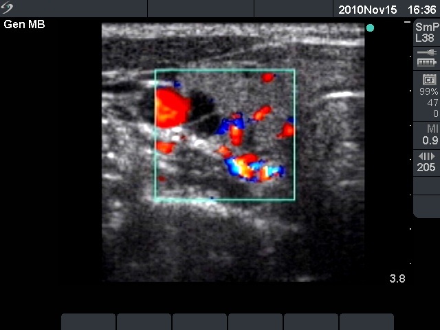The ultrasound pattern of de Quervain's thyroiditis and that of papillary cancer are very similar: a hypoechogenic lesion with blurred borders are found in both cases. They differ in vascularization statistically but the vascular pattern has only limited practical significance. In the acute phase of de Quervain's thyroiditis the vascularization is generally decreased but even in this case the situation was the opposite. The finding of not one but multiple hypoechogenic areas favored the possibility of subacute thyroiditis.