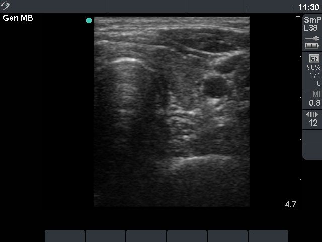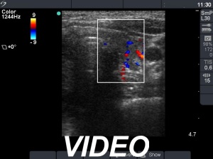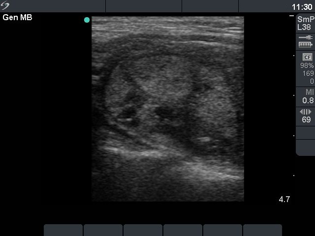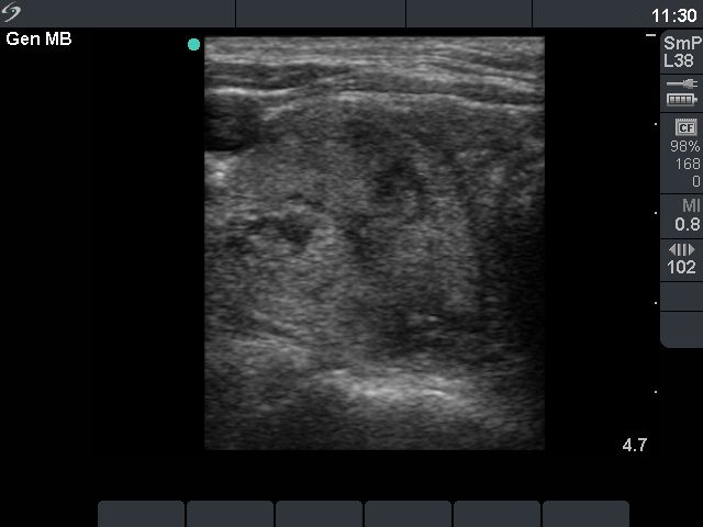 Ultrasonography: The thyroid was moderately hypoechogenic and showed increased vascularity. There was an echonormal nodule in the right lobe with combined perinodular and intranodular vascular pattern.