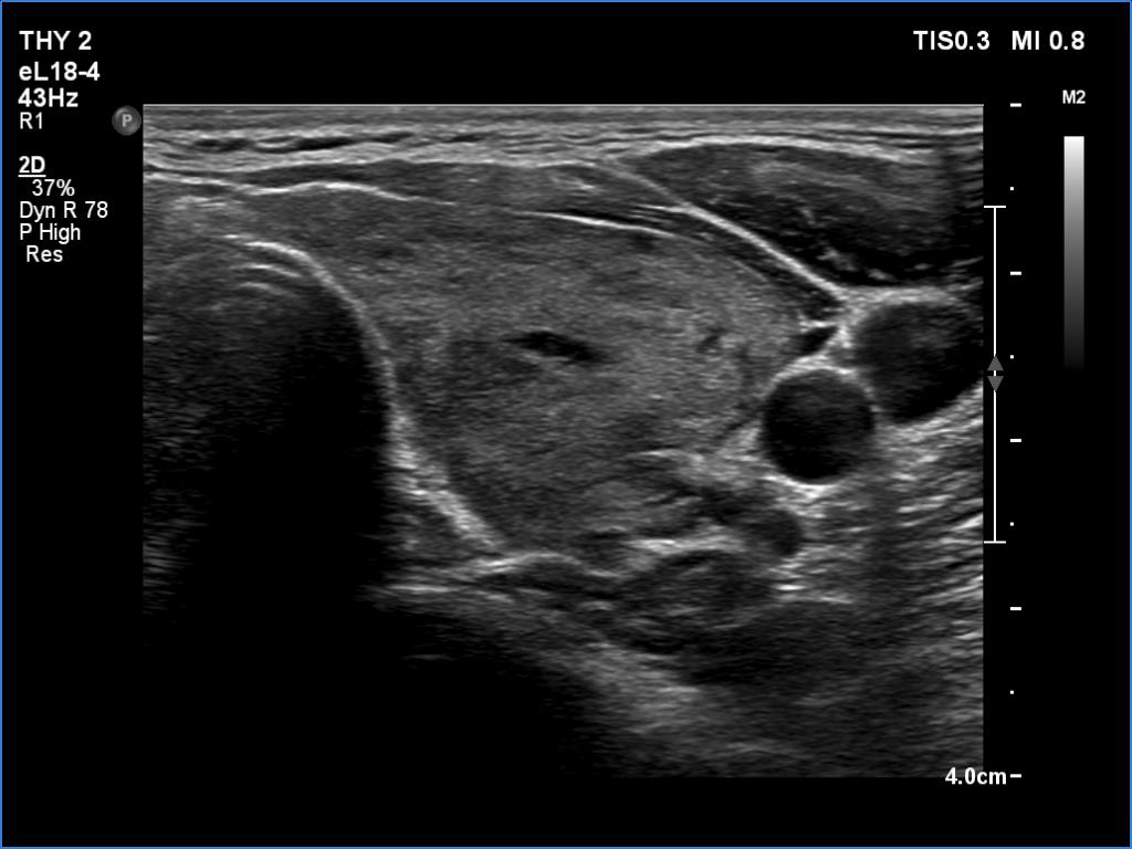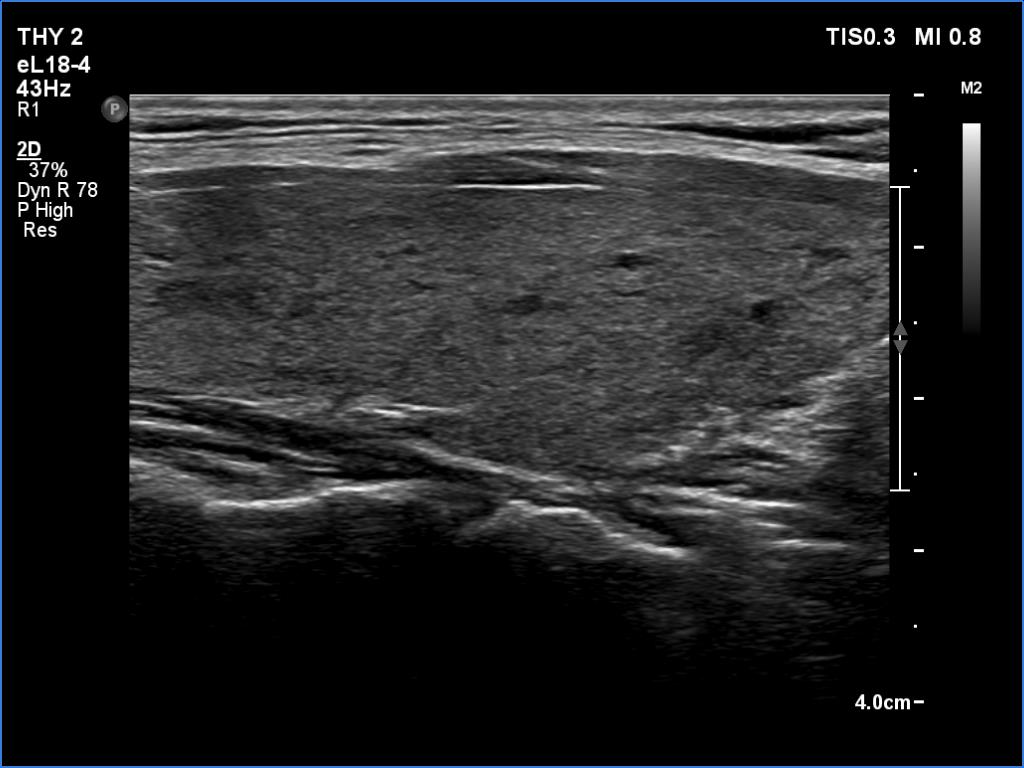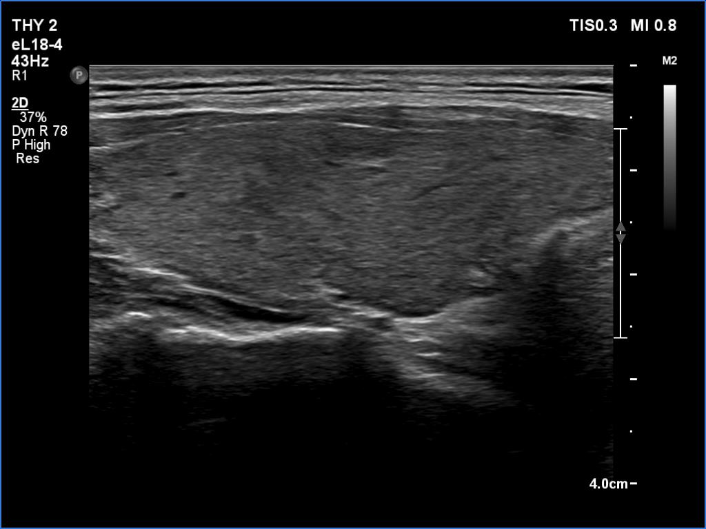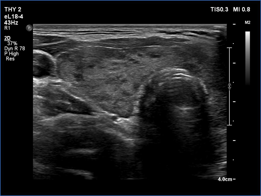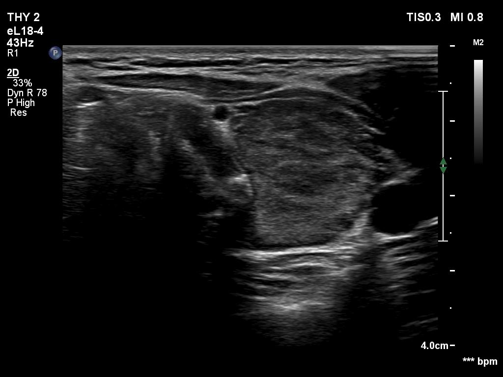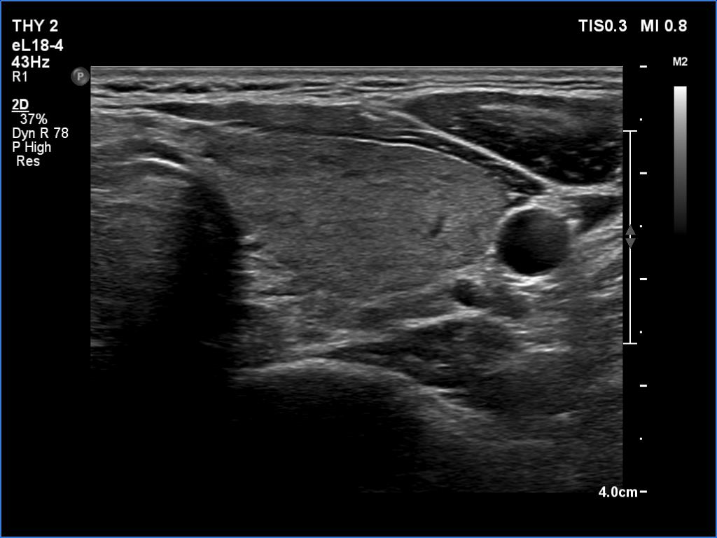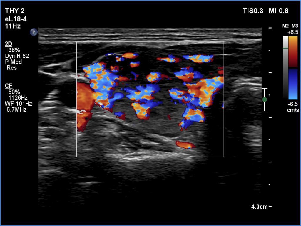 Clinical data: A 35-year-old woman was referred for a newly diagnosed hyperthyroidism. The patient had typical complaints, including elevated heart rate and weight loss.