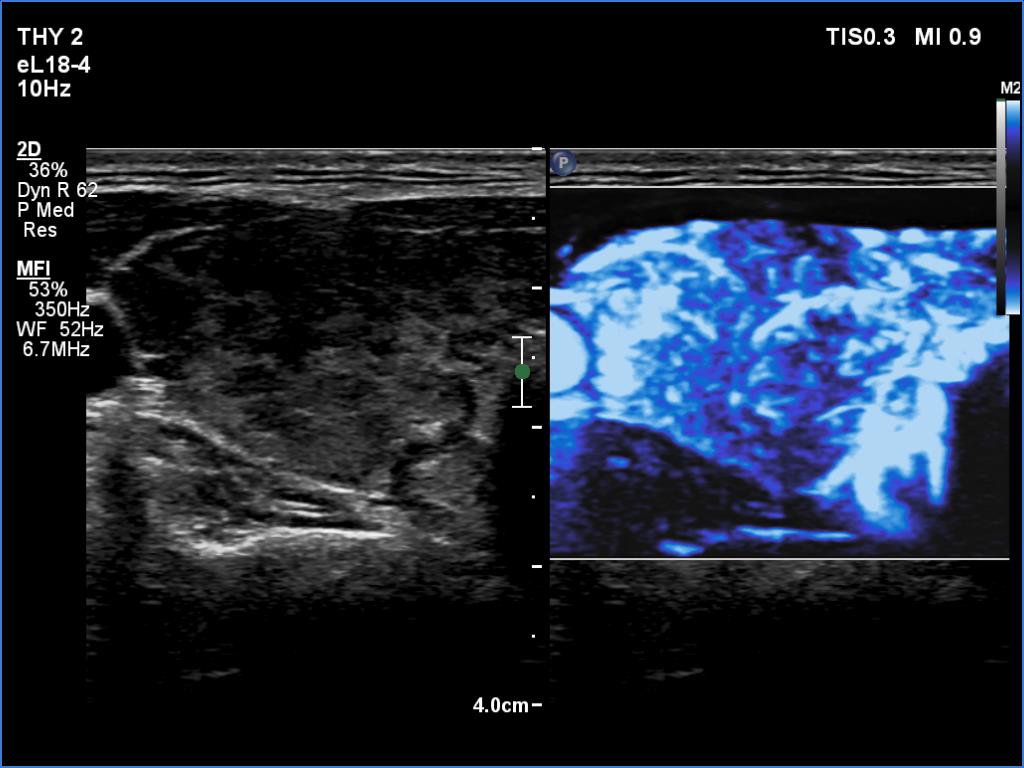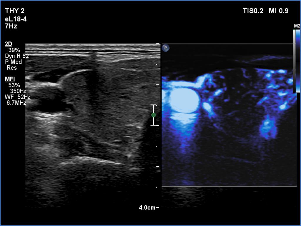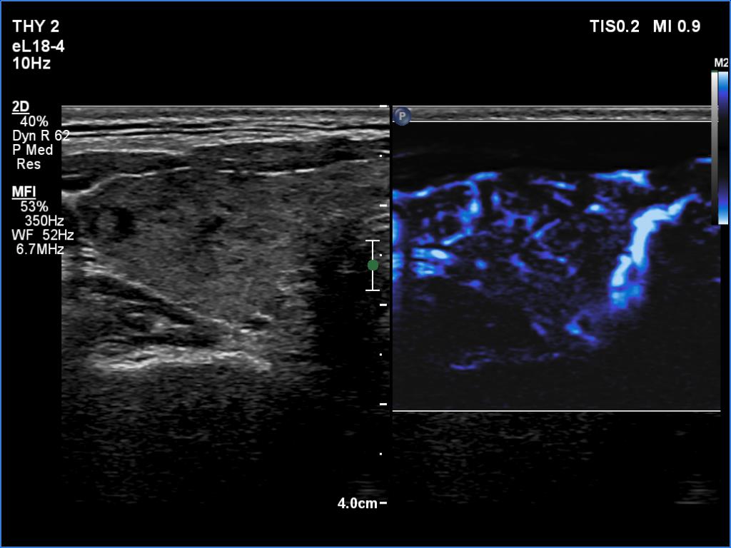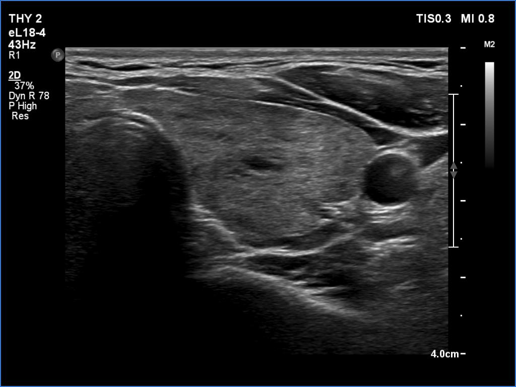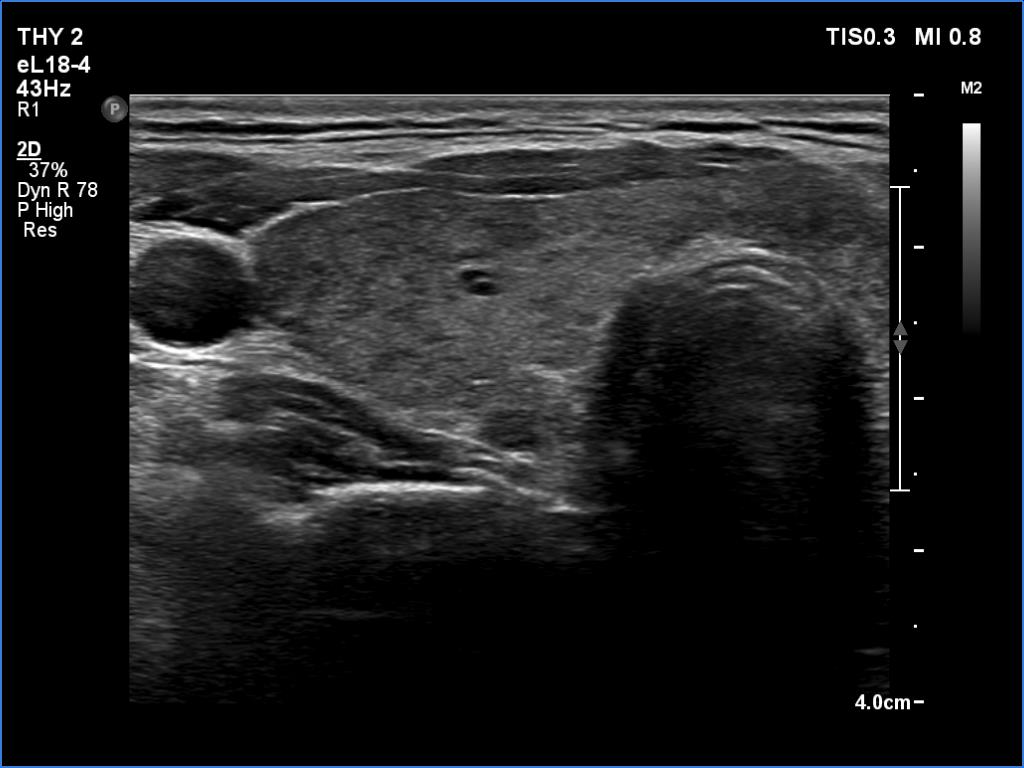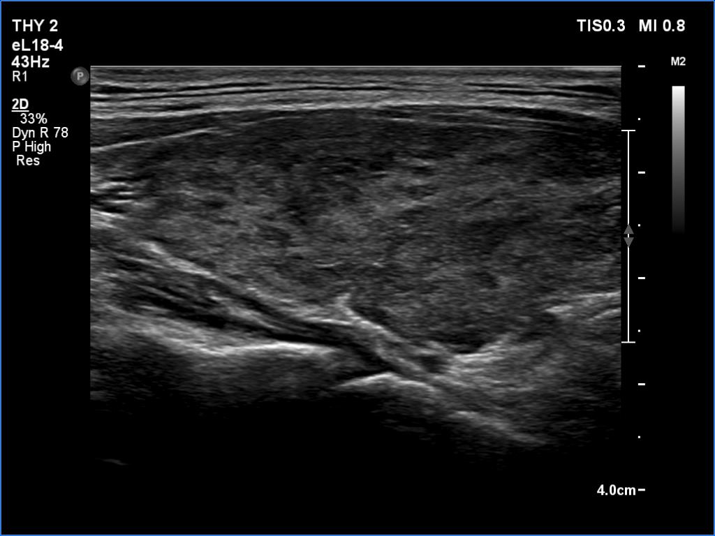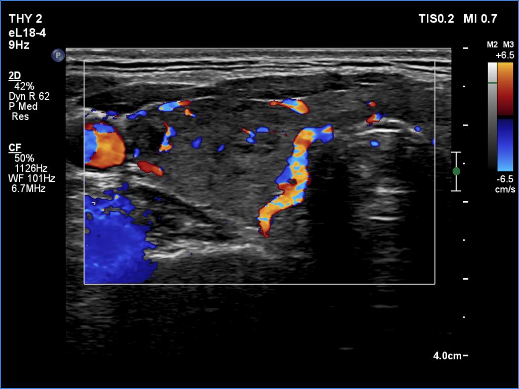Clinical data: A 35-year-old woman was referred for a newly diagnosed hyperthyroidism. The patient had typical complaints, including elevated heart rate and weight loss.