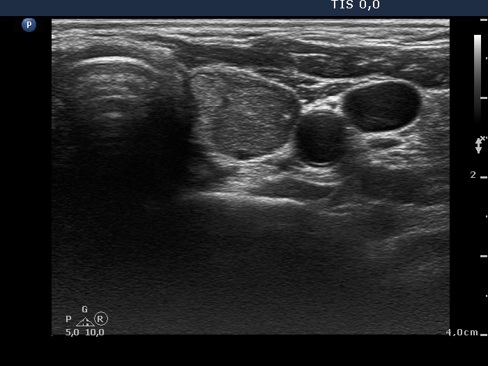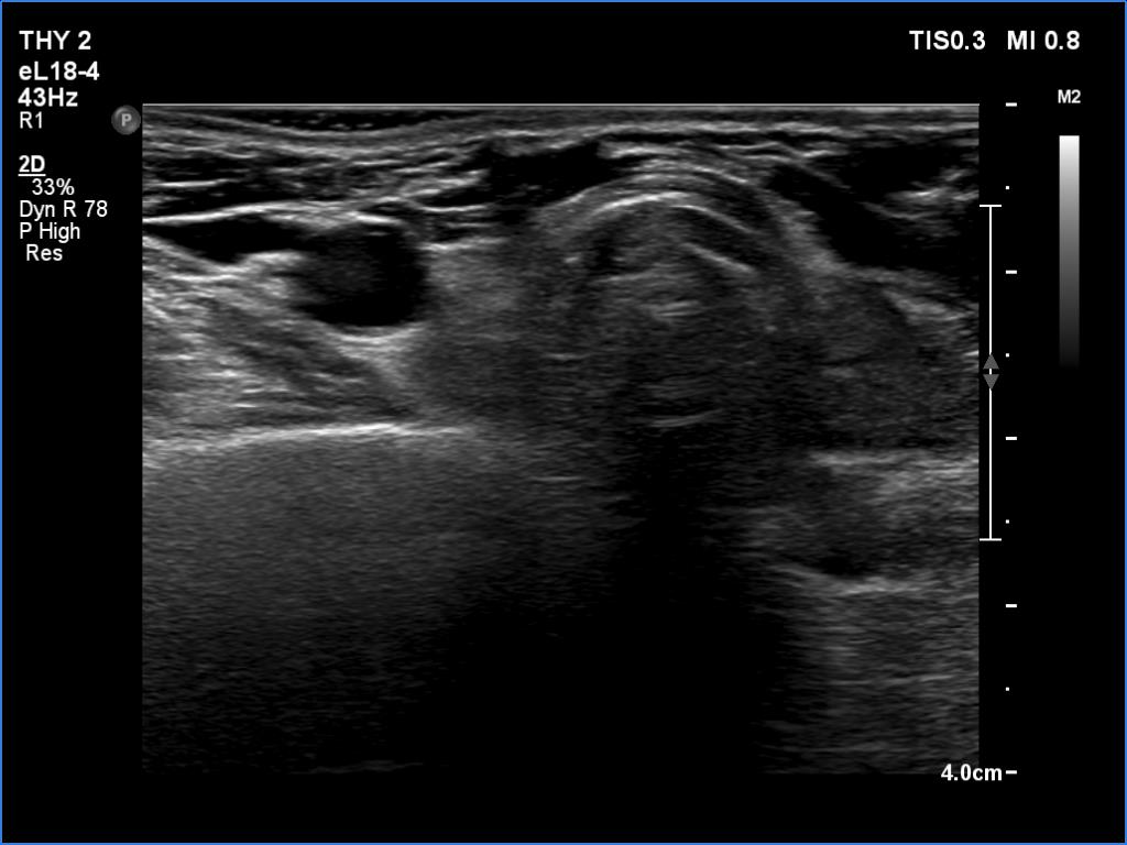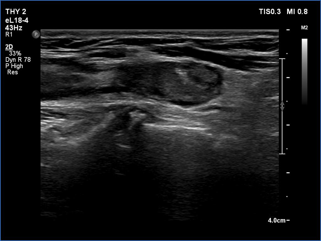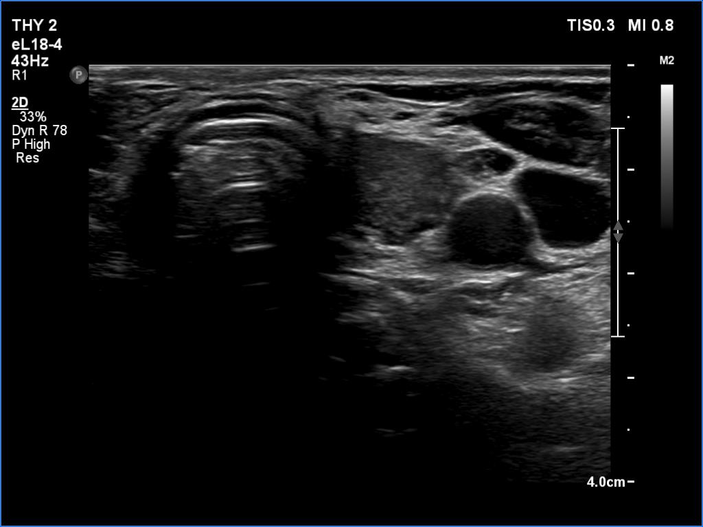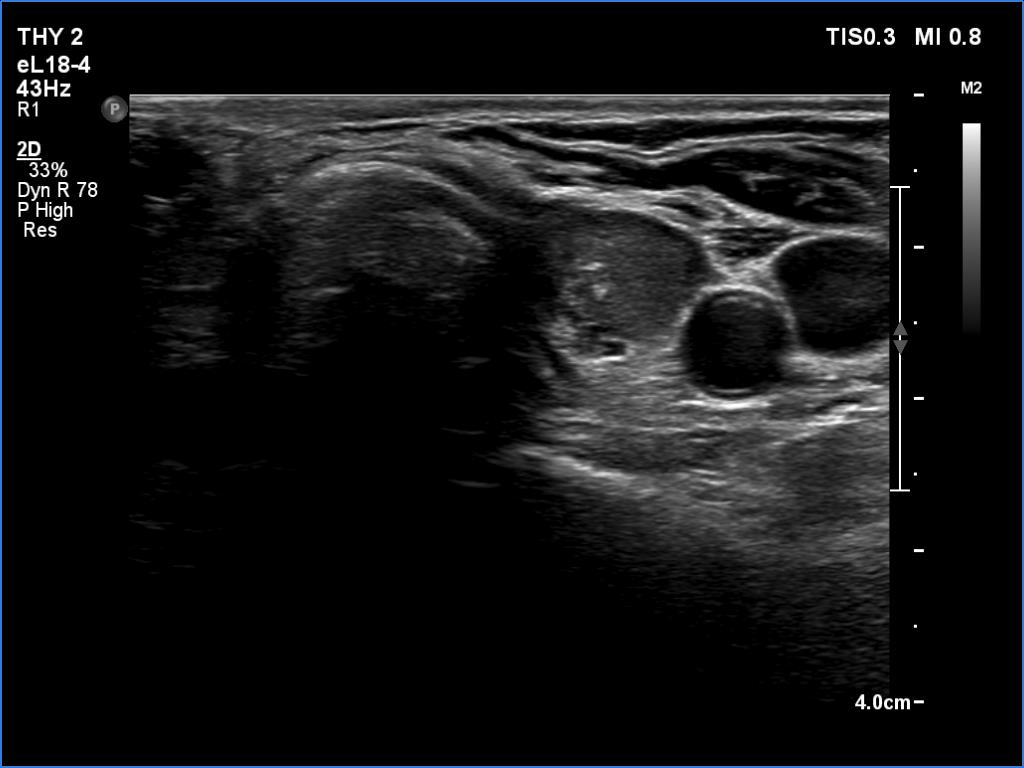 Ultrasonography. The presentation of the thyroid was essentially the same. The mass in question became smaller. This was avascular and proved to be hard on elastography.