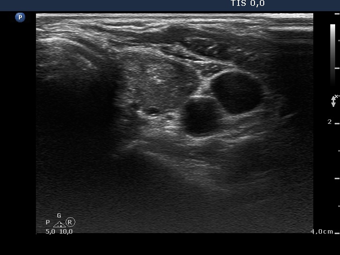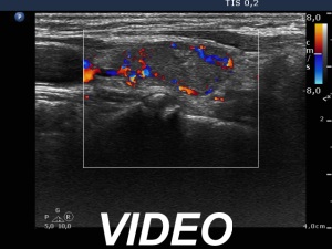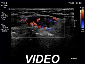 Clinical data: A 61-year-old woman was referred for evaluation of a suspicious recurrent nodule which was discovered on carotid Doppler examination. The patient was operated on Graves' disease 17 years ago. Histopathology disclosed diffuse goiter.