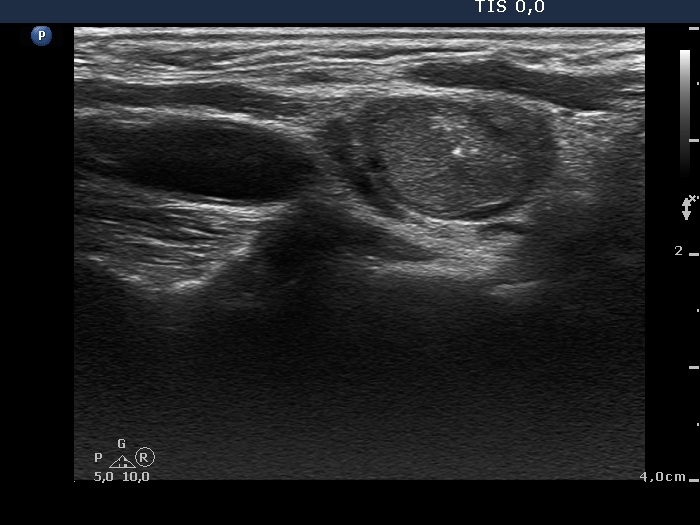 Ultrasonography. There was a small, moderately hypoechoic remnant according to the resected right lobe while a much larger but still small remnant was found in the left thyroid bed. The latter had an amorphous discrete lesion which presented bright echogenic granules. The lesion was avascular.