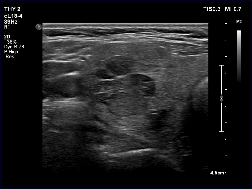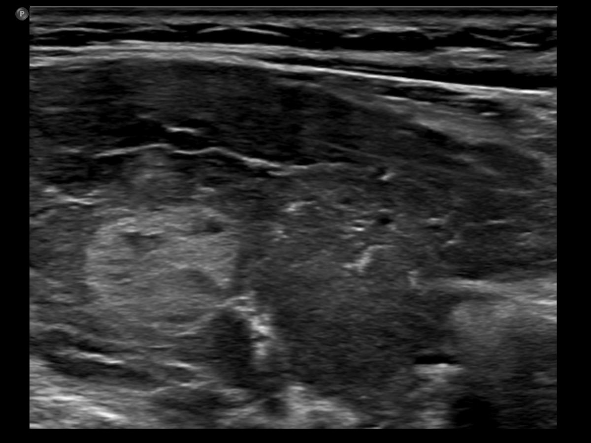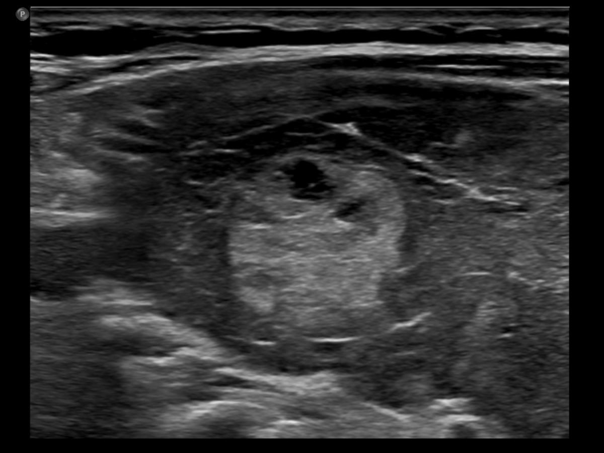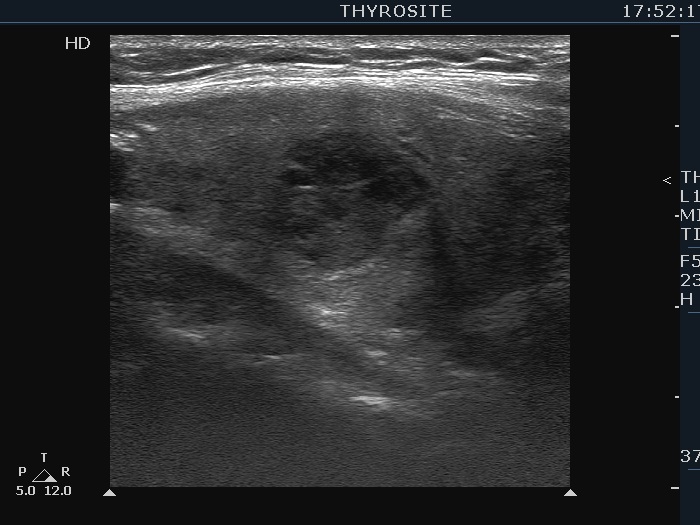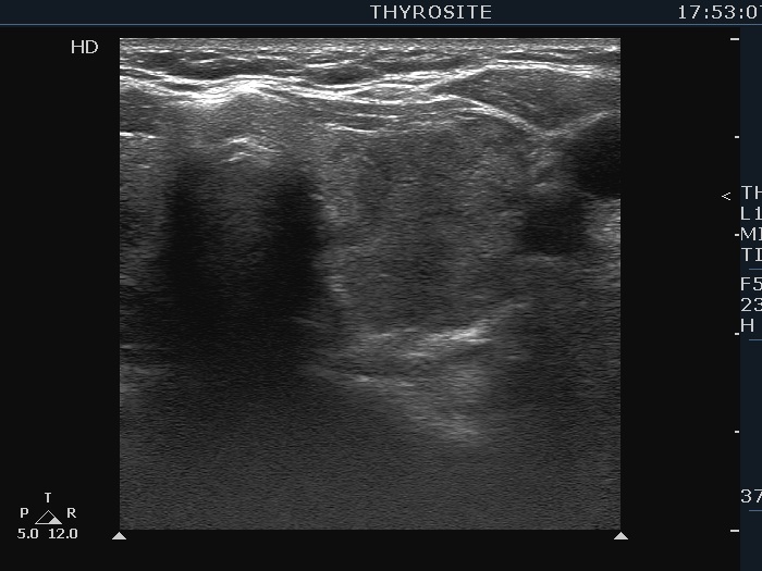 Ultrasonography. The thyroid was moderately hypoechoic. There was a more hypoechoic lesion in the central part of the lobe. The lesion was avascular.Aspiration cytology of the lesion resulted in benign hormonal atypia.