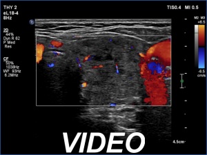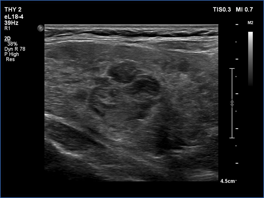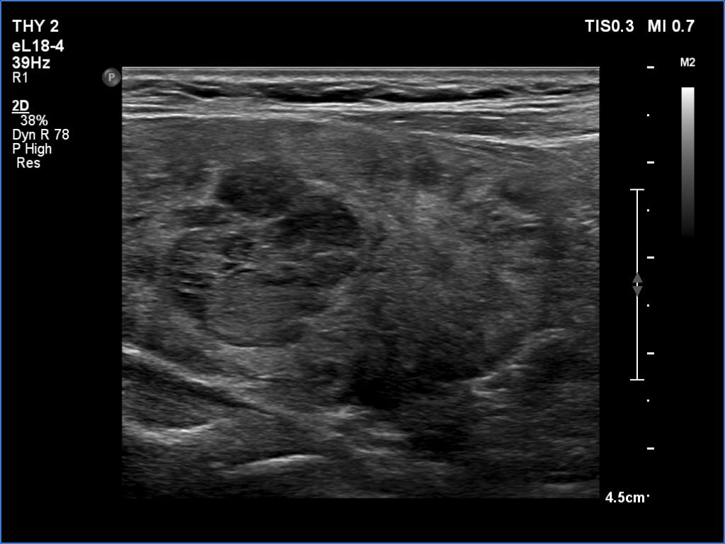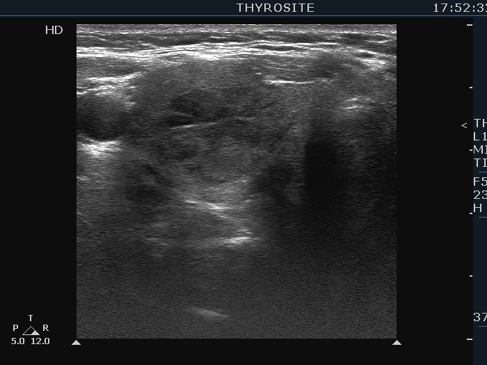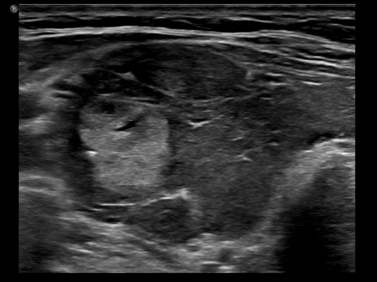 Ultrasonography. The thyroid was moderately hypoechoic. There was a more hypoechoic lesion in the central part of the lobe. The lesion was avascular.Aspiration cytology of the lesion resulted in benign hormonal atypia.