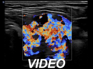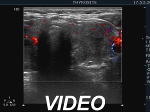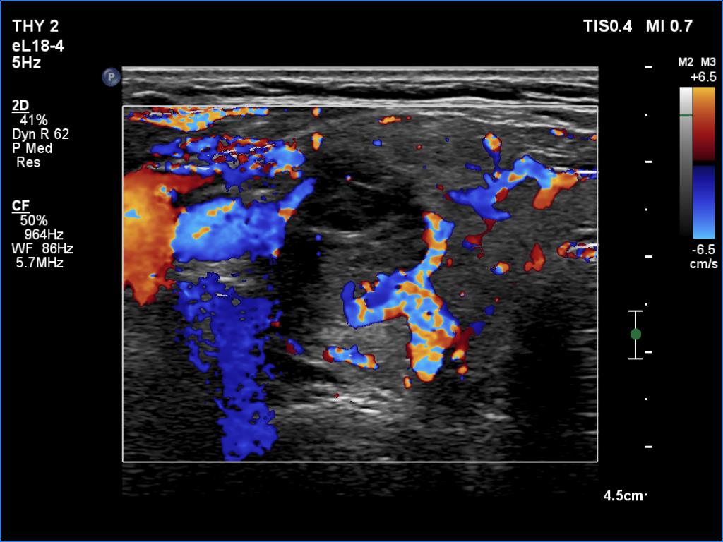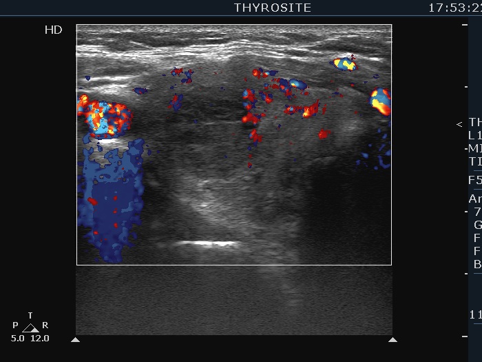 Ultrasonography. The thyroid became more hypoechoic while the lesion in the central part of the right lobe did hyperechoic. The vascularization of the thyroid was extremely increased.The patient was told that it is very likely that her hyperthyroidism will relapse therefore we suggested radioiodine therapy.