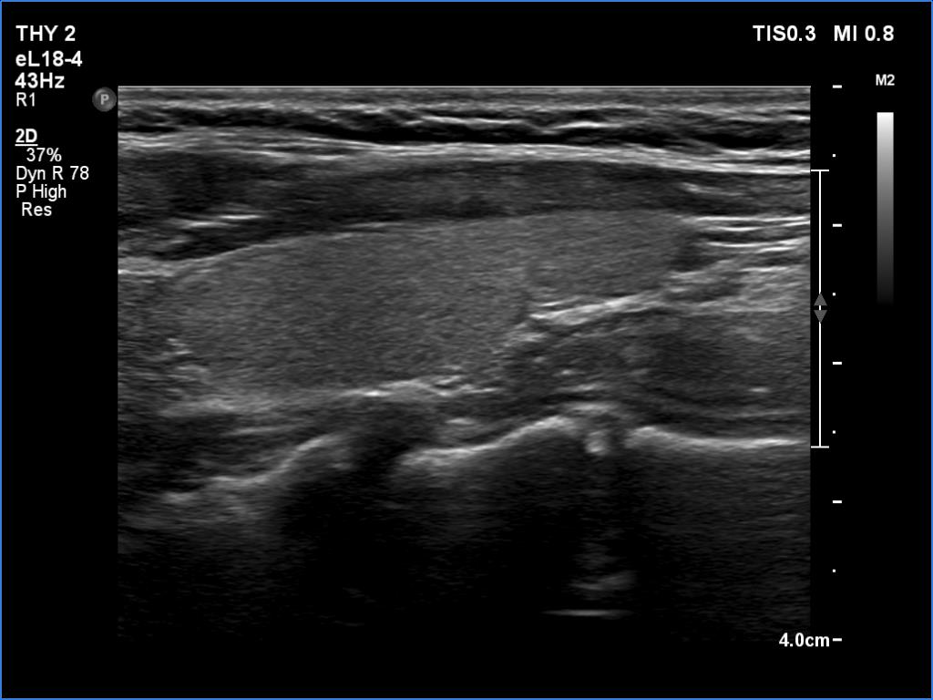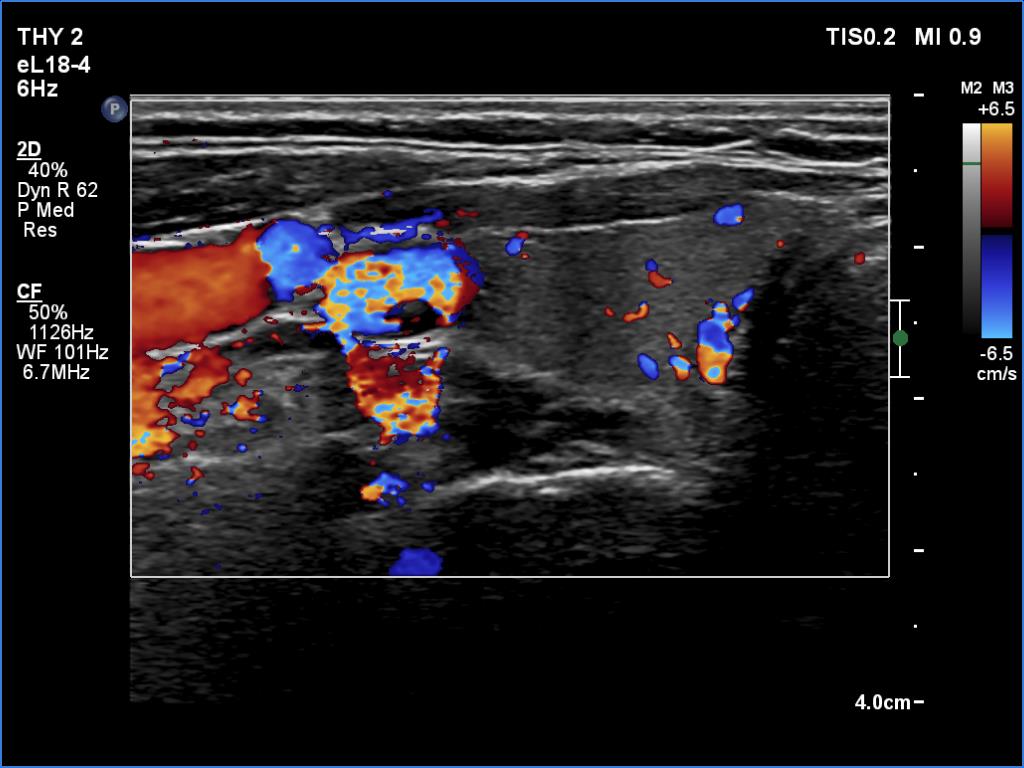 A completely intact thyroid with average or decreased vascularity does not exclude the possibility of an autoimmune hyperthyroidism of significant degree, but substantially decreases the chance of that - except for recurrent hyperthyroidism. If a patient who has been never treated for thyroid disease presents with FT4 level at least twice as high as the upper limit with such ultrasound pattern, with such ultrasound pattern, we regularly repeat the blood test. A failure of the first blood test can be revealed in around half of these cases.