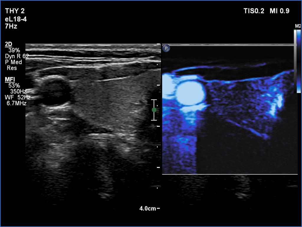 Ultrasonography. The thyroid was echonormal. There were no discrete lesions. The vascularity was average or slightly decreased. Microflow imaging has not revealed increased number of intrathyroidal vessels.