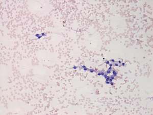 Cytology was performed from the hyperechogenic nodule and resulted in suspicion of papillary carcinoma. (The two rows of cytological images represent two different smears.)