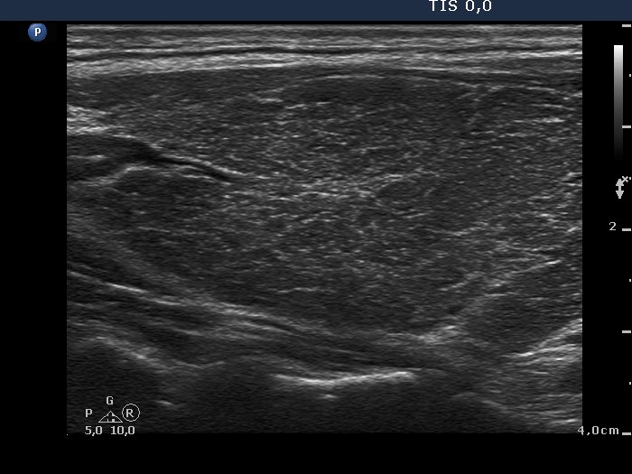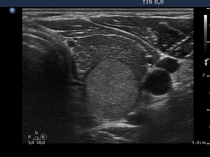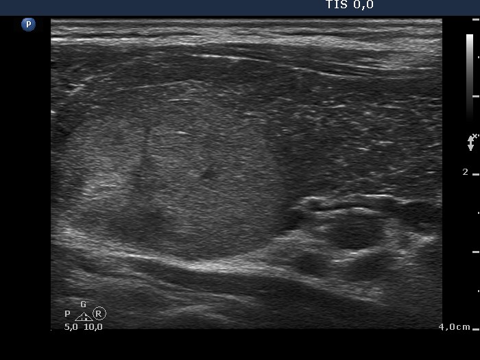 Ultrasonography. A diffusely hypoechogenic thyroid was found with extensive fibrosis. There was an echonormal nodule in the upper dorsal part of the left lobe. The nodule showed taller-than-wide shape and halo sign while the presence of perinodular blood flow was equivocal.