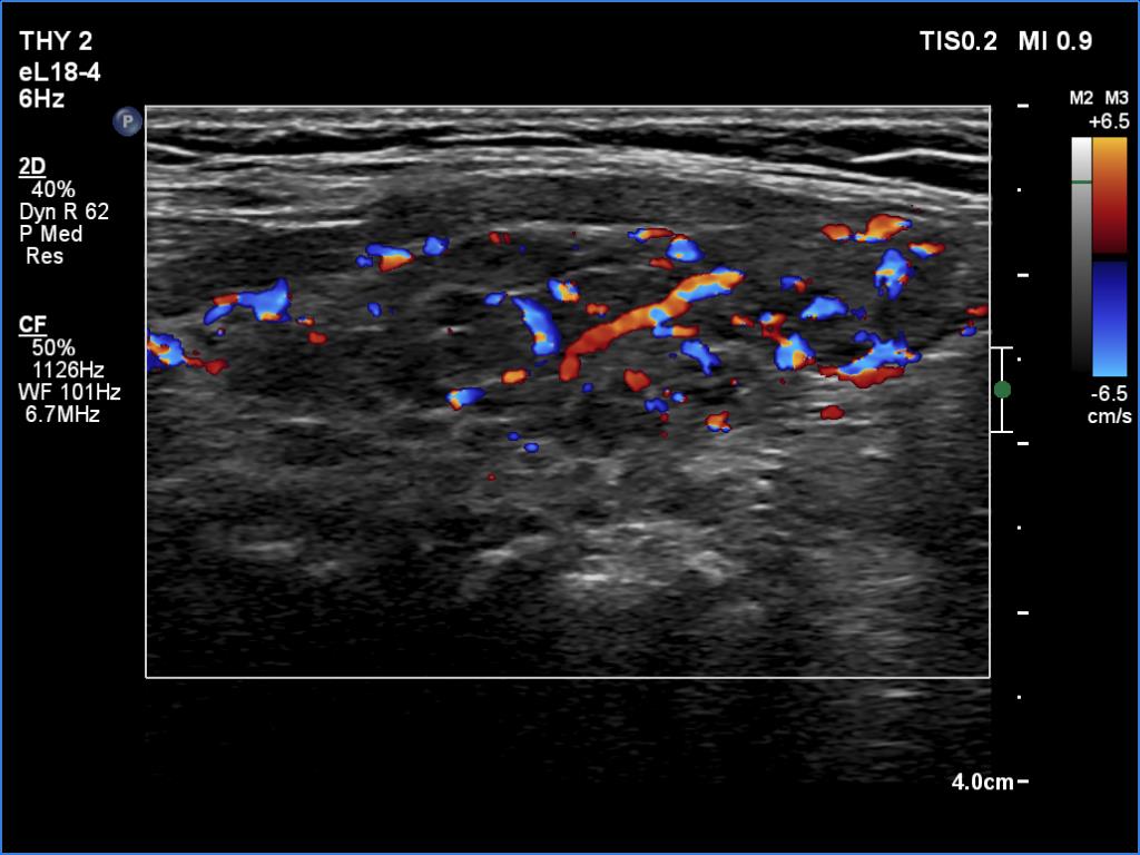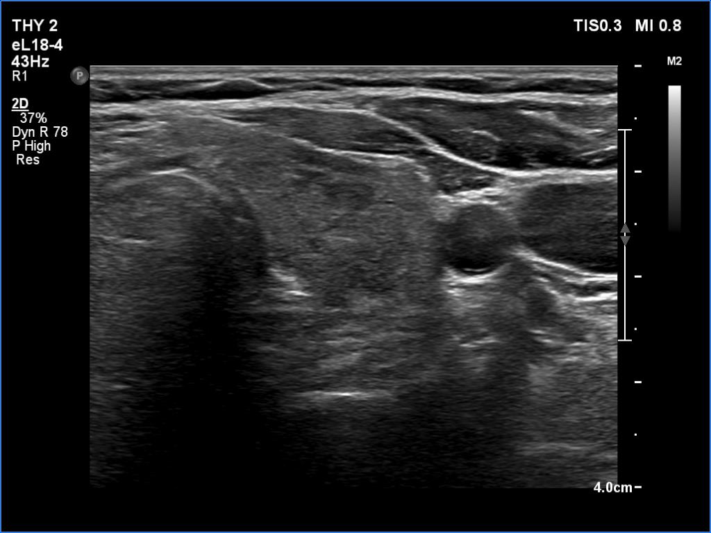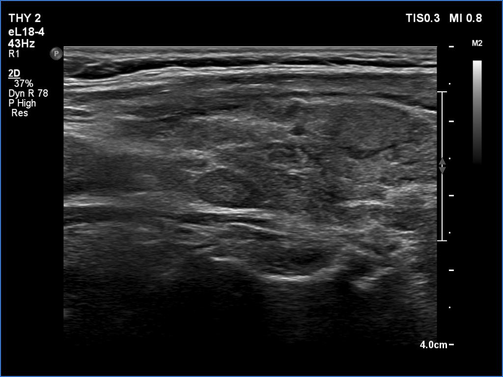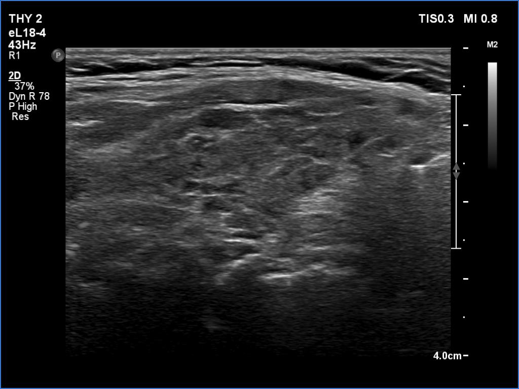 Ultrasonography. The thyroid was minimally hypoechoic and had several discrete areas of various echogenicities. None of these lesions corresponded to true nodule.
