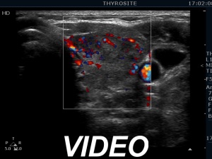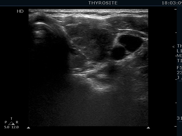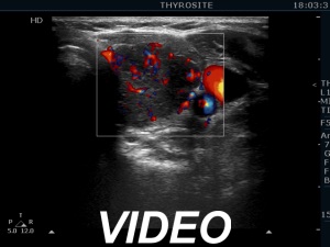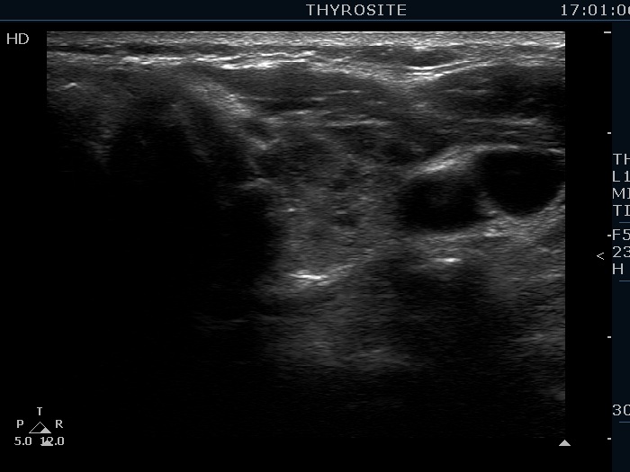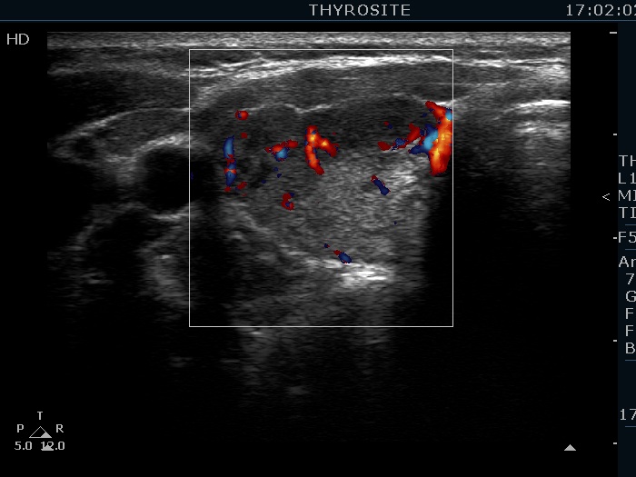 Ultrasonography. The thyroid was echonormal and presented numerous hypoechogenic discrete areas. The echogenicity index was approximately 30%. None of the discrete areas corresponded to pathological nodule. The vascularity was a bit lower than the average.