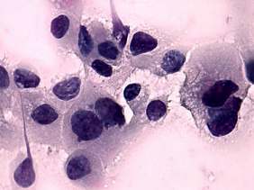 Comment. Although the recurrence of the breast cancer was very likely on the clinical and cytological data, a thyroidal origin could not be fully excluded. Note that the patient was disease free for 5 years and the only PET-positive finding was this lymph node far from the breast.