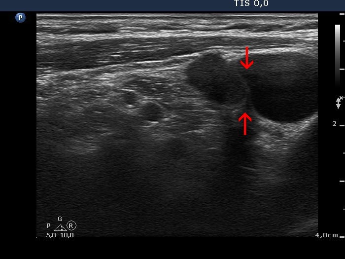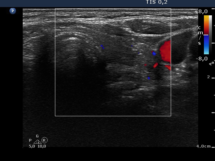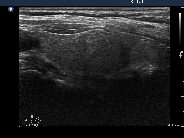 Ultrasonography: the right thyroid was echonormal while the left lobe contained moderately hypoechogenic areas with a 50% echogenicity index. There was a hypoechogenic mass lower and lateral to the right thyroid. The lesion did not present a regular hilum.