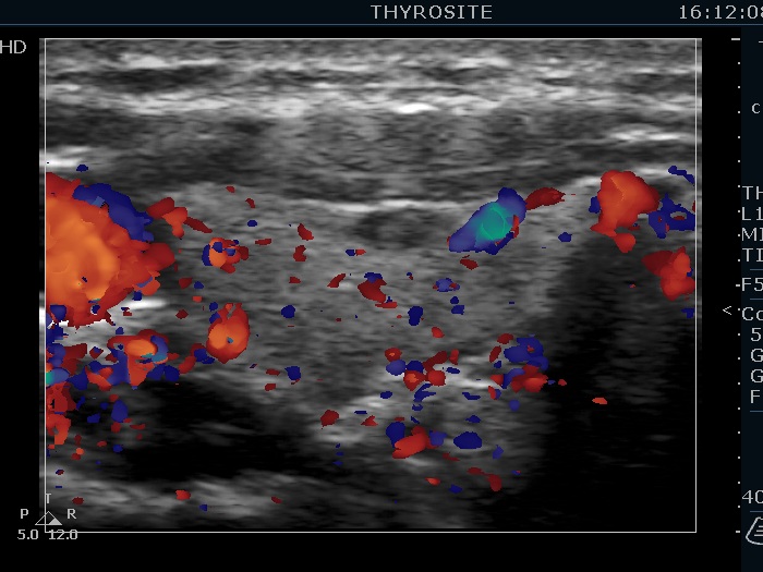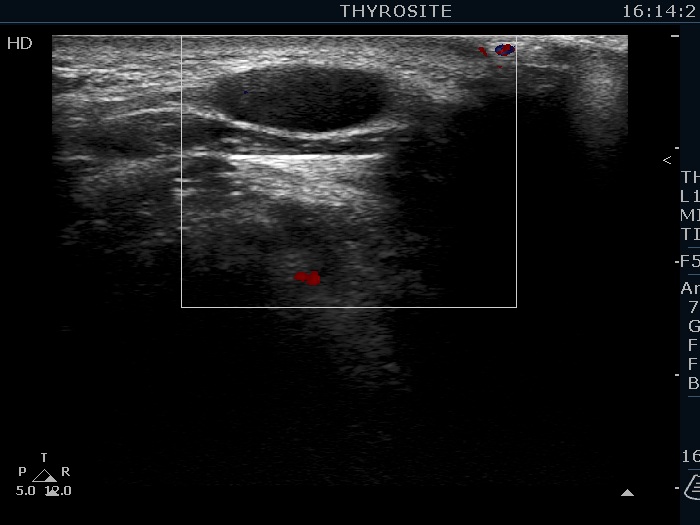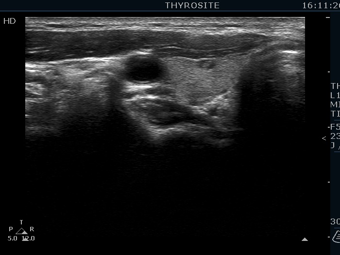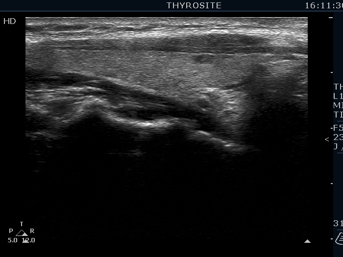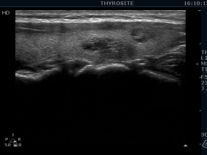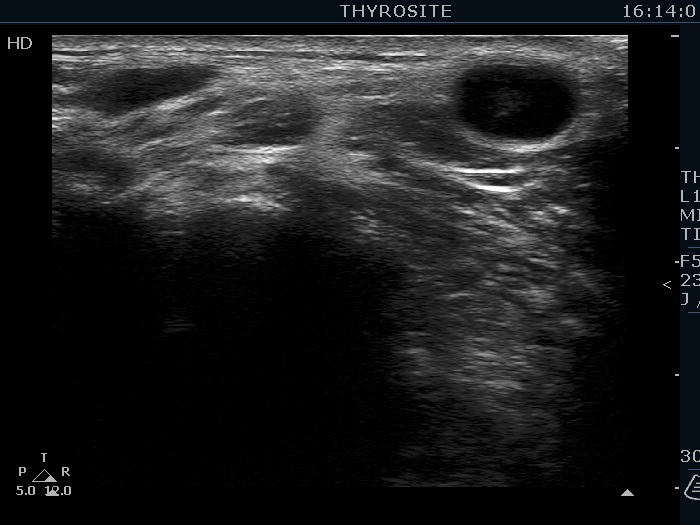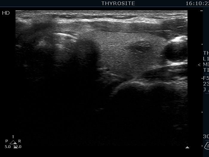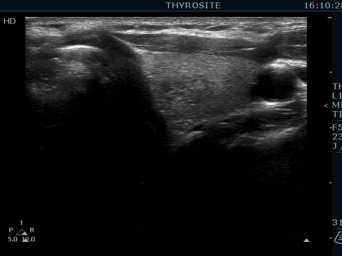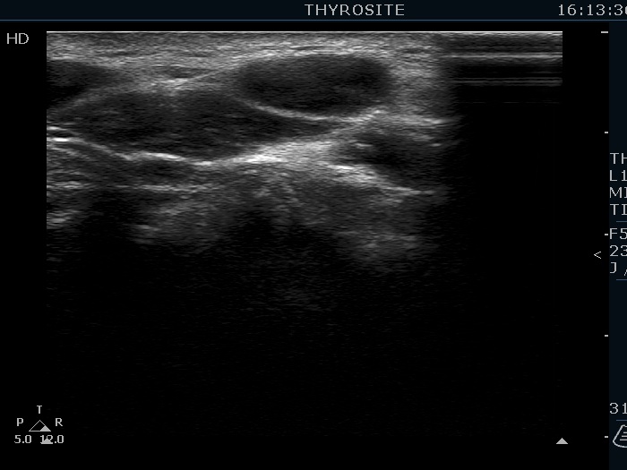 Ultrasonography. The thyroid was echonormal. There were several hypoechoic nodules in the left lobe. The middle one had back wall cystic figures. There were 3 or four discrete, deeply hypoechoic lesions above and lateral to the left lobe in the neck. One of them presented with a hilum-like figure while the others lacked hilum.