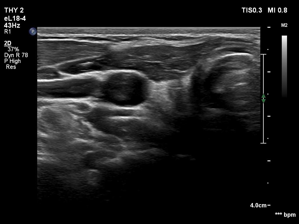 Clinical data: The patient was referred for evaluation of a continuously increasing thyroglobulin level which resulted in 2.86 ng/mL, 5.74 ng/mL and 20.1 ng/mL, at the 2-yr, 5-yr and 7-yr follow up. Cytology of enlarged lymph nodes, multiple CT-scans and PET-CTs failed to reveal recurrence.