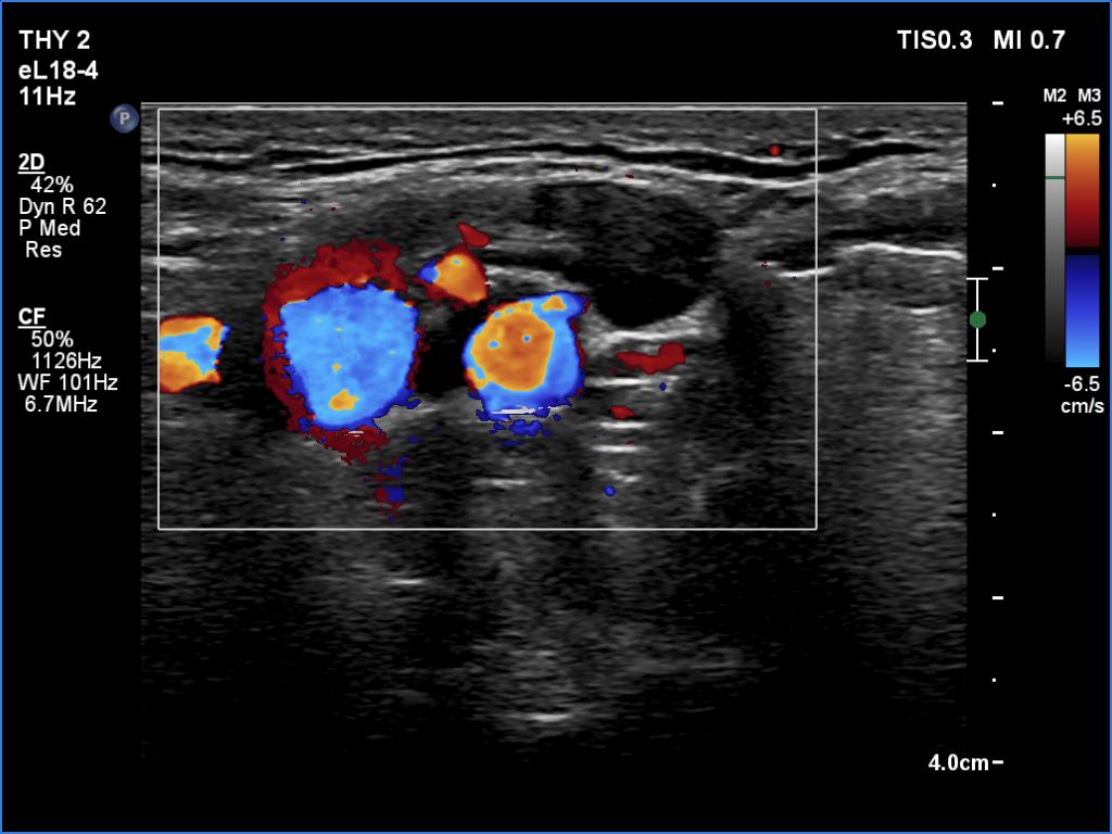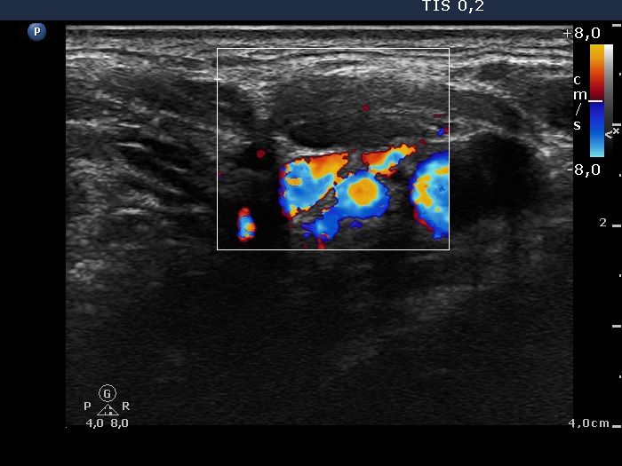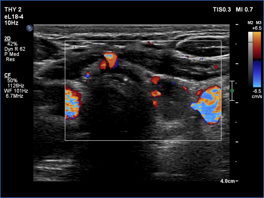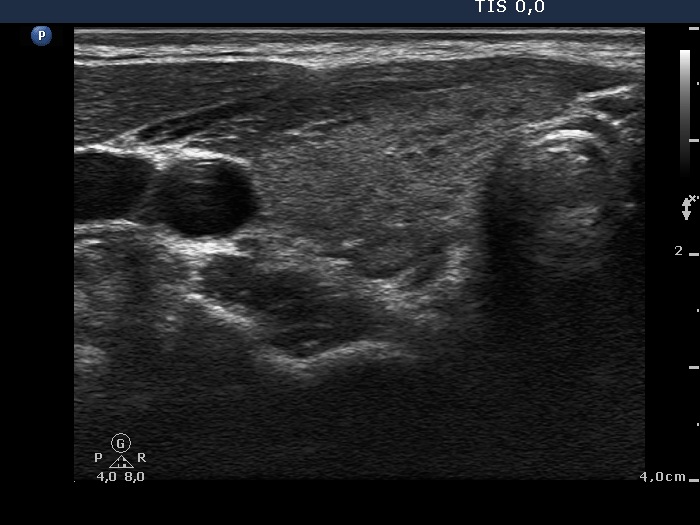 Ultrasonography revealed hypoechoic discrete lesions in both thyroid lobes. The lesions presented microcalcifications. Corresponding to the palpable mass in the right submandibular region, a reactive-type regular lymph node was found. There was an enlarged lymph node in the left submandibular region. The node had a regular hilum but displayed a heterogeneous pattern.