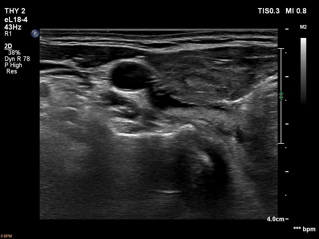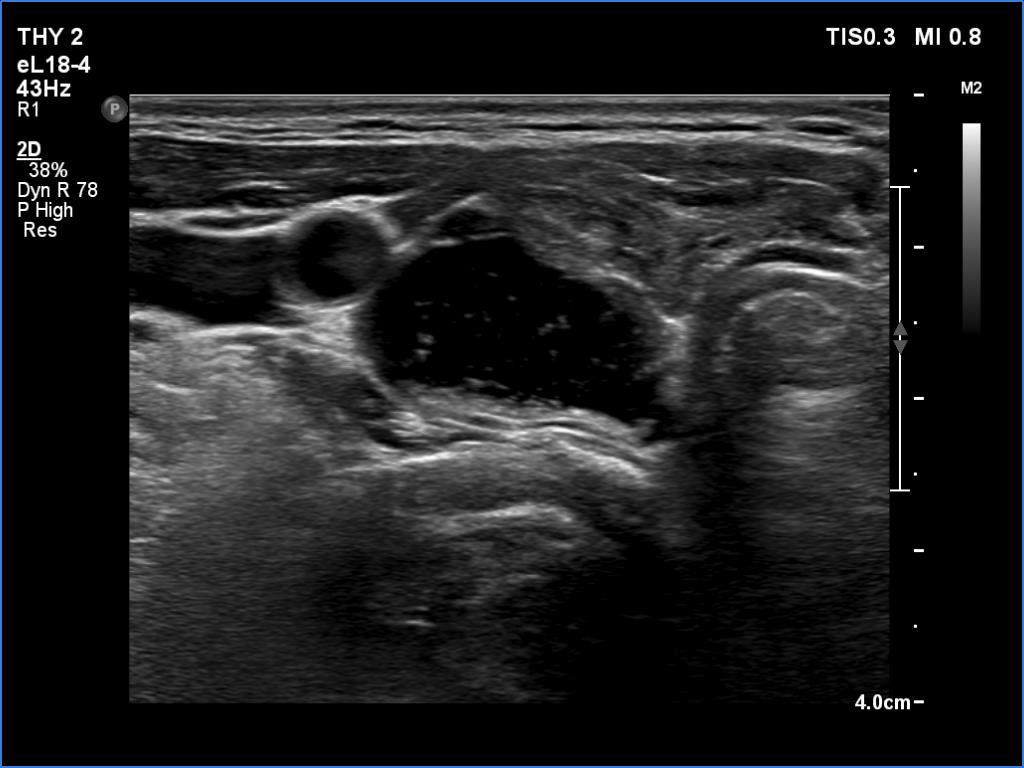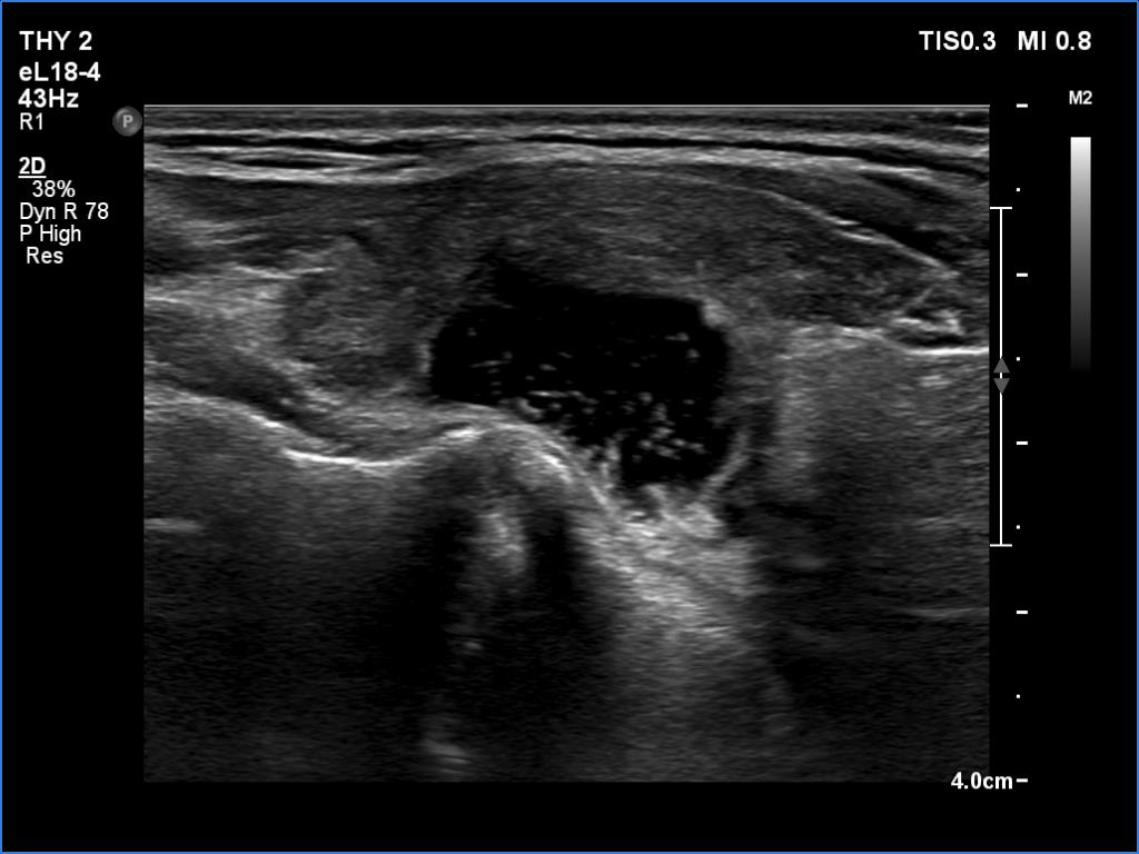 Clinical data: A 44-year-old woman was referred for aspiration cytology of a cystic mass which was found on ultrasound examination. Ultrasound was performed as part of the evaluation of a newly diagnosed hypothyroidism 3 months ago.