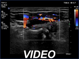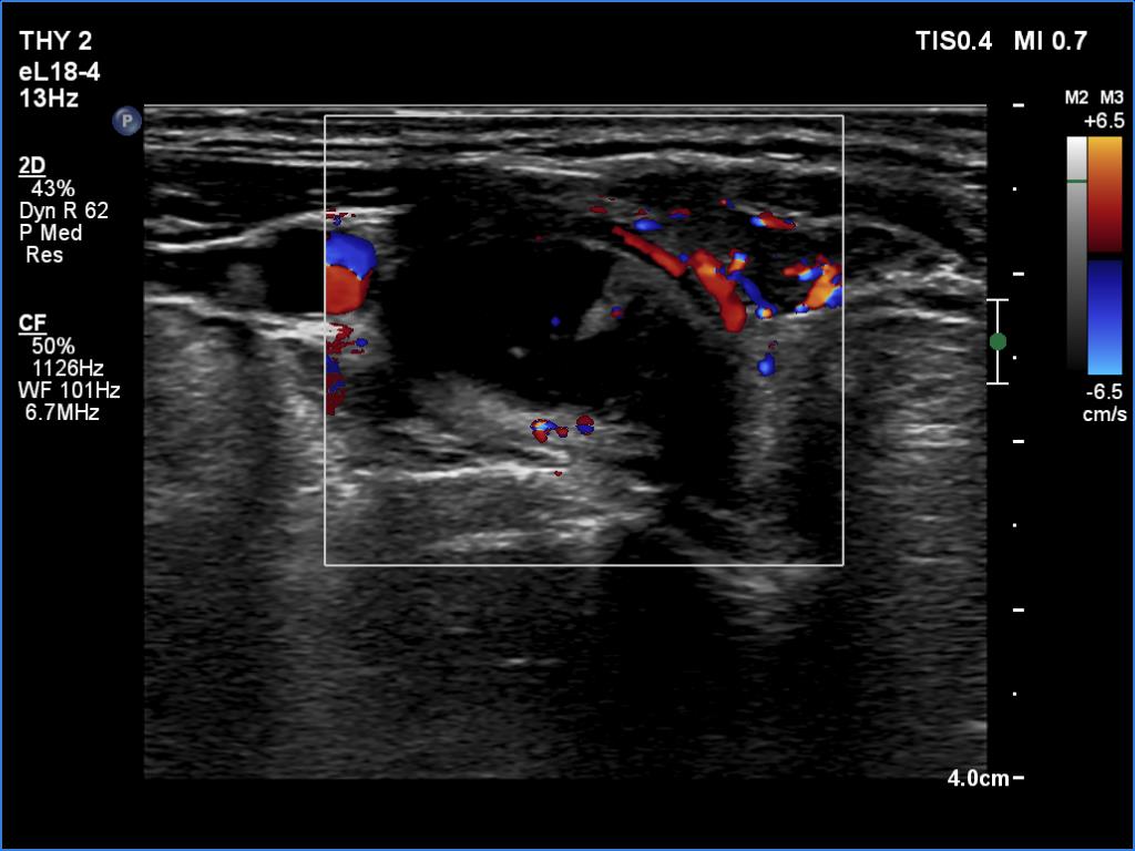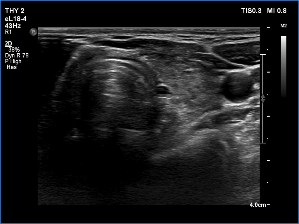 Ultrasonography. The thyroid was hypoechoic and presented several more hypoechoic and echonormal islets corresponding to the underlying thyroiditis. There was a mixed, dominantly cystic mass dorsal to the lower two-third of the right lobe. The lesion has echonormal solid part and showed intracystic echogenic figures.
