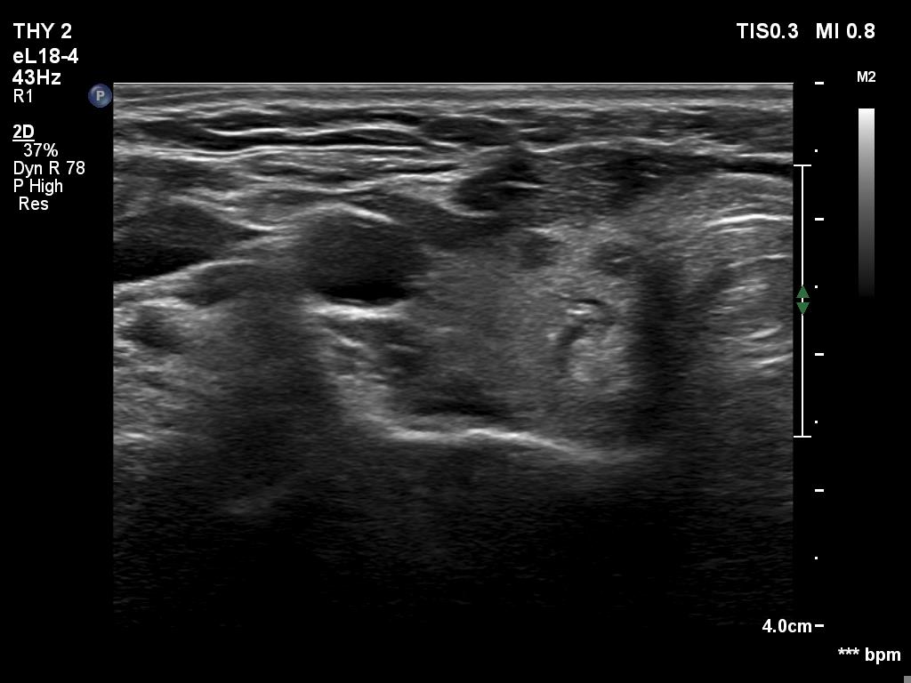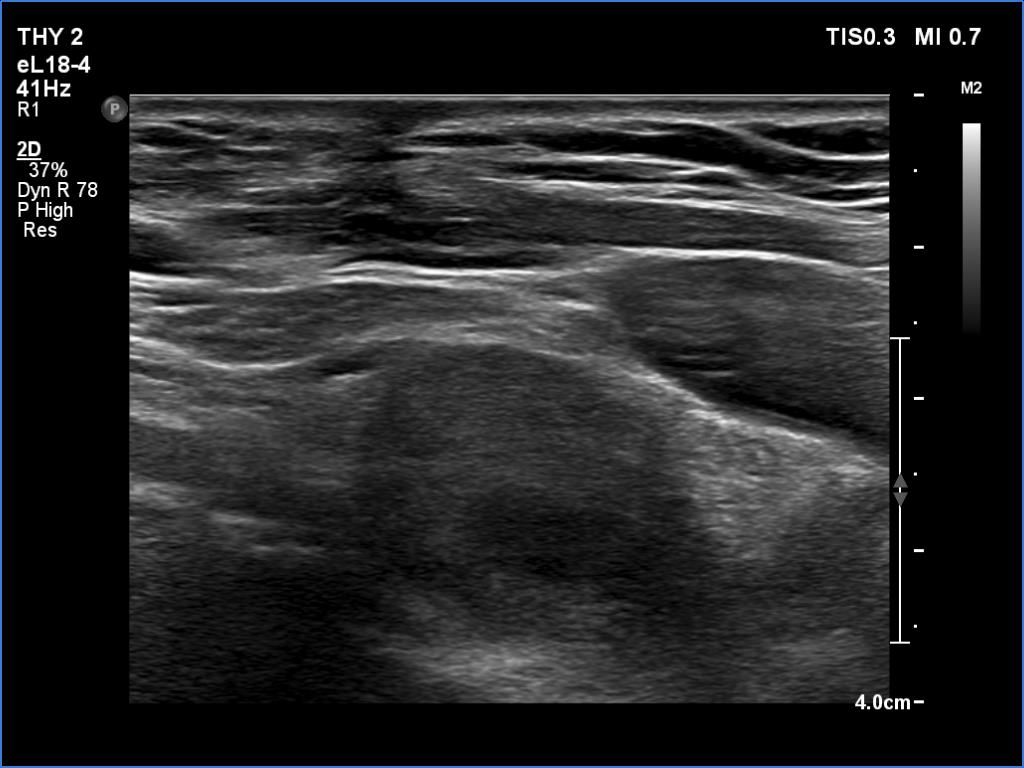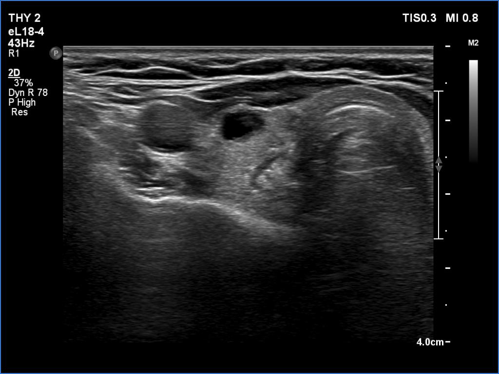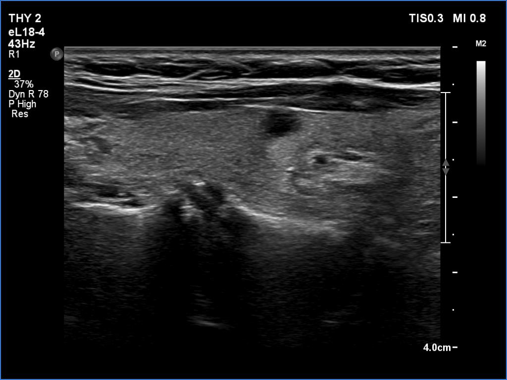 Ultrasonography. The thyroid was echonormal and had several tiny hypoechoic areas and an echonormal nodule in the lower third of the right lobe. We did not find any lesion of clinical or oncological significance.