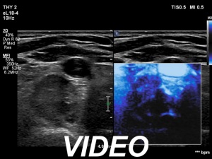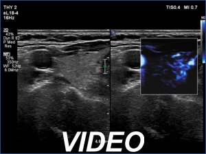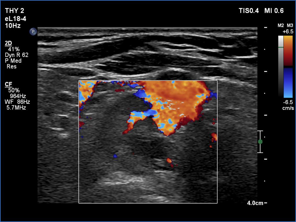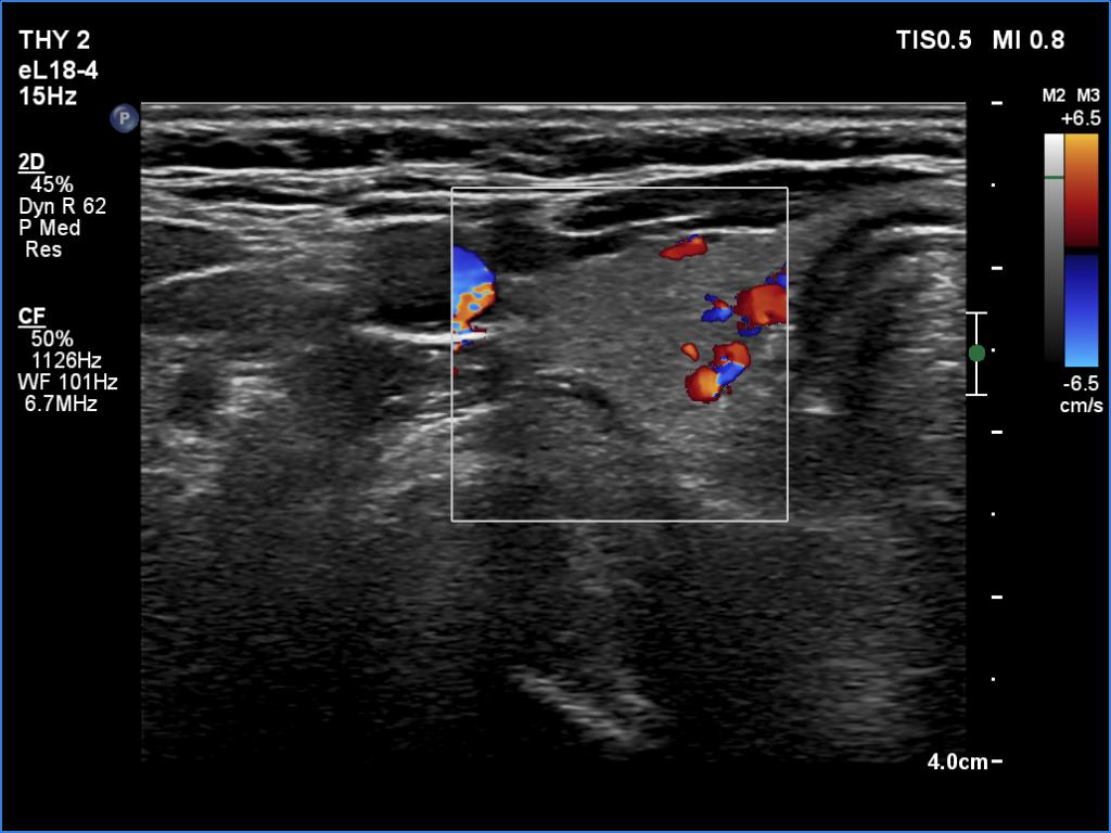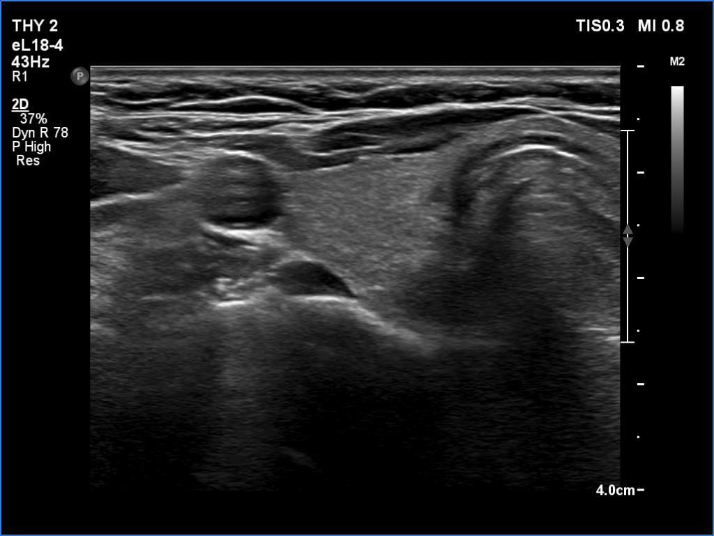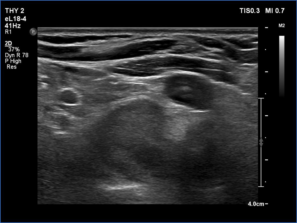 Ultrasonography. The thyroid was echonormal and had several tiny hypoechoic areas and an echonormal nodule in the lower third of the right lobe. We did not find any lesion of clinical or oncological significance.