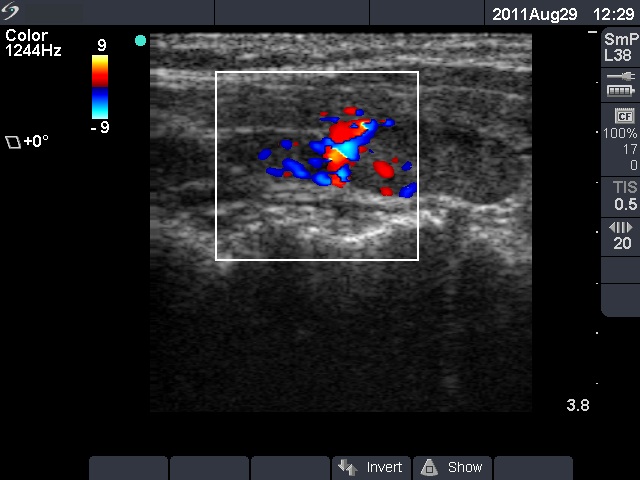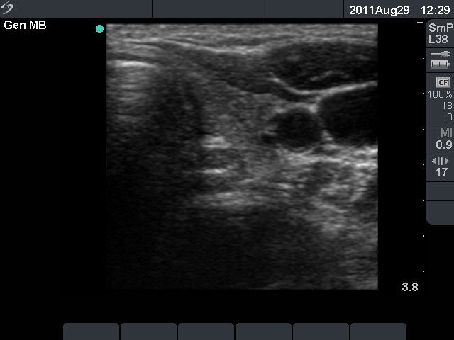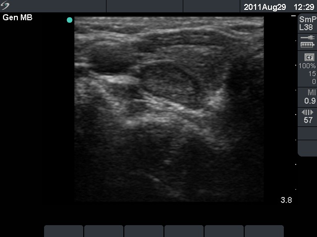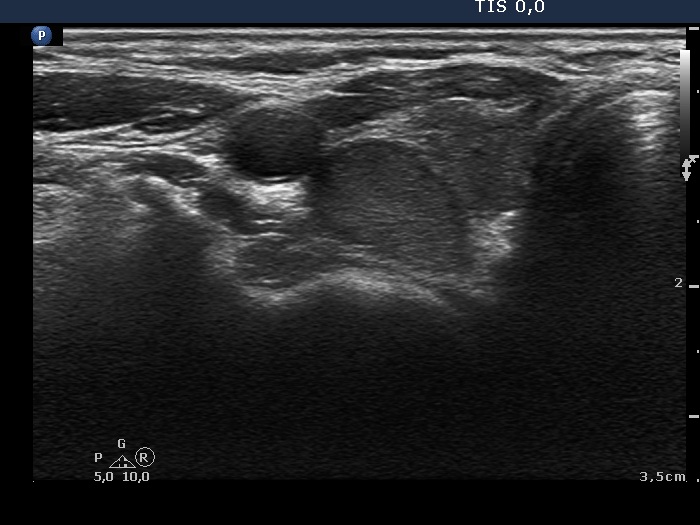 Ultrasonography: The thyroid was moderately hypoechogenic. There were two more hypoechogenic lesions in the dorsal part of the right lobe.