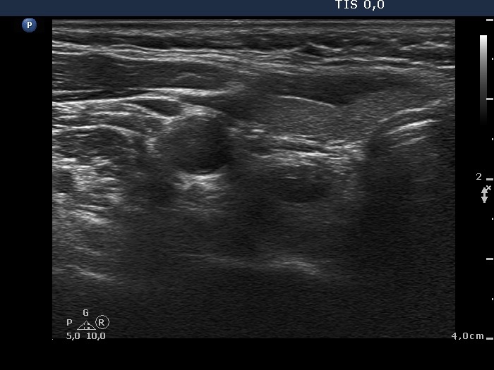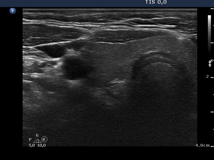Ultrasonography. The thyroid was minimally hypoechoic and had several insignificant hypoechoic lesions. There was a solid-cystic mass dorsal to the lower pole of the right lobe.