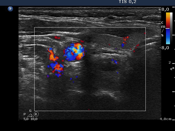 Aspiration cytology of the lesion was performed. There were only scattered, non-atypical epithelial cells on the smear which was gained form a small amount of serous tissue.