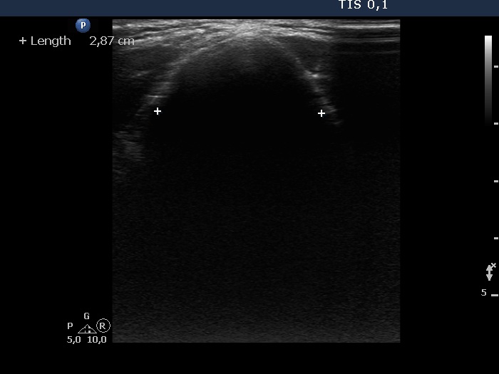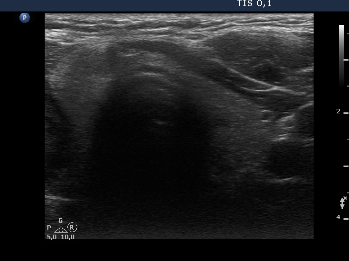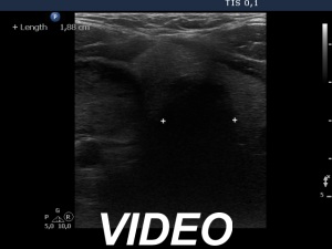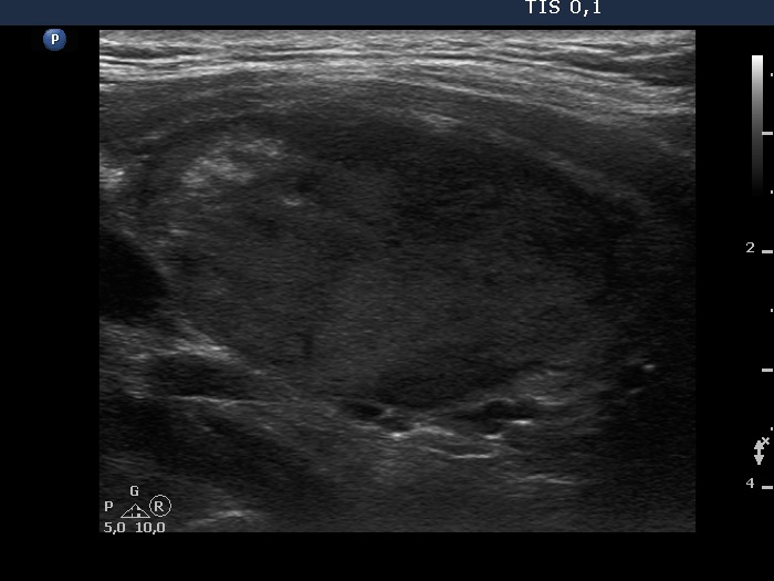 Ultrasonography. The thyroid was echonormal. There was a hypoechoic nodule in the right lobe. The dimensions of the nodule were 39x21x42 mm, width, depth and length, respectively. The lesion had a partial halo and both perinodular and intranodular vascularity.