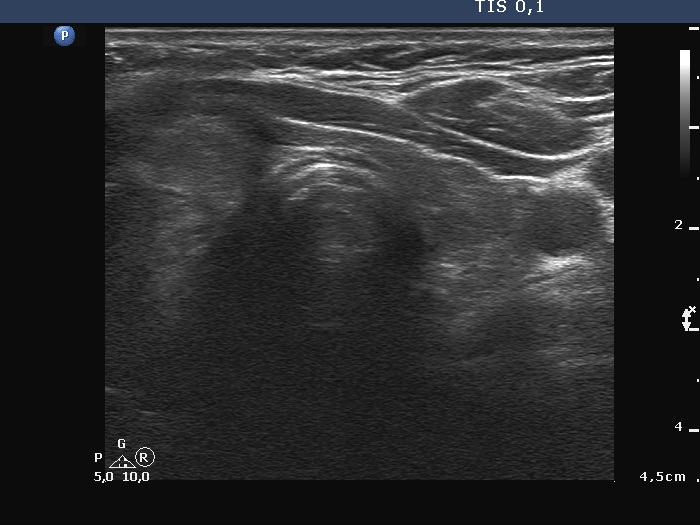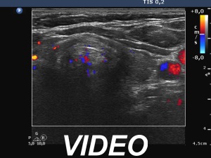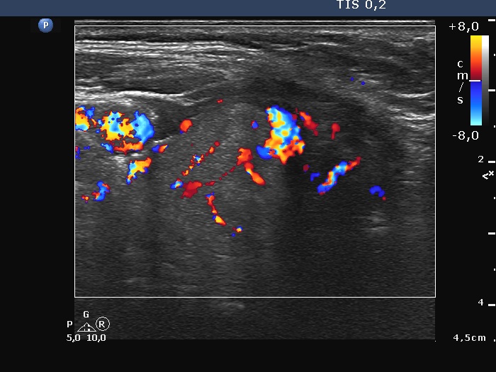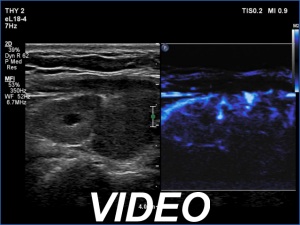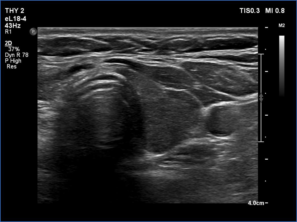Ultrasonography. The thyroid was hypoechoic. There was a large, irregular, echonormal mass in the right lobe. The lesion presented both intranodular and perinodular vascularity. The left lobe was decreased in size.