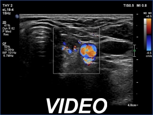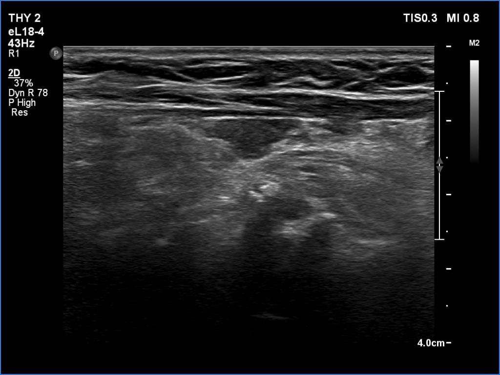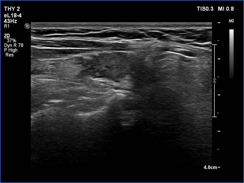 Clinical data: A 64-year-old woman came to a routine follow-up. She has been operated on a multinodular goiter for more than 20 years. A total thyroidectomy was performed. A recent thyroid ultrasound resulted in thyroiditis or recurrent nodule.