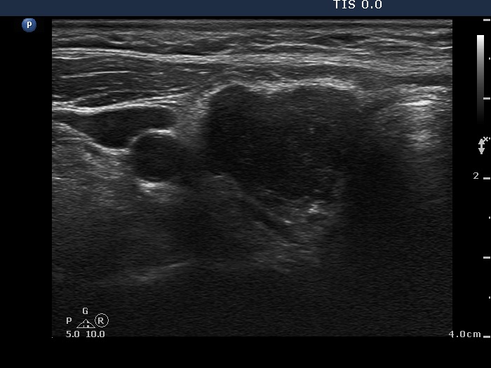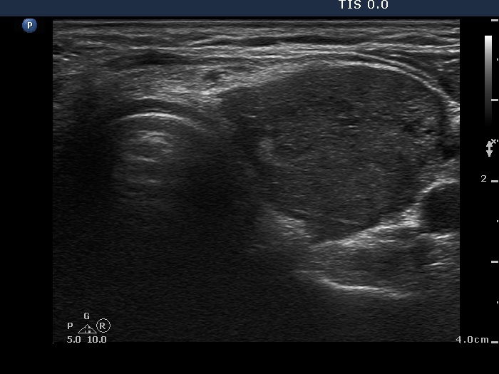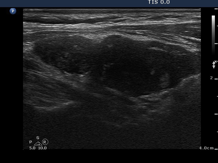 The sonographic pattern is specific. At first sight both lobes, particularly the right one seems to be nodular. First, the lobes are composed of a central hypoechogenic part surrounded with an echonormal rim, therefore it seems like the lobes were composed of a large hypoechogenic nodule. Second, connective tissue, perhaps a scar makes an impression in the ventral and in the dorsal part of the right and the left lobe, respectively. This makes an appearance as the lobes were composed of two nodules or one lesion with irregular lobulated and spiculated margins. In fact, the scar is responsible for the irregularities seen on the surface of the hypoechogenic mass, and regarding the hypoechogenic mass, the inclinations are the primary cause.