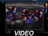 Ultrasonography: The right lobe was hypoechogenic, the left was moderately hypoechogenic. Both lobes were irregular in shape and were composed of several circumscribed areas surrounded with echonormal rim. The vascularization was significantly increased.