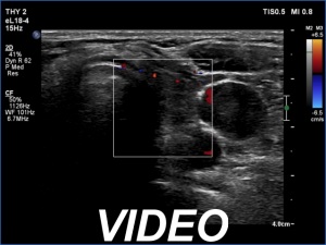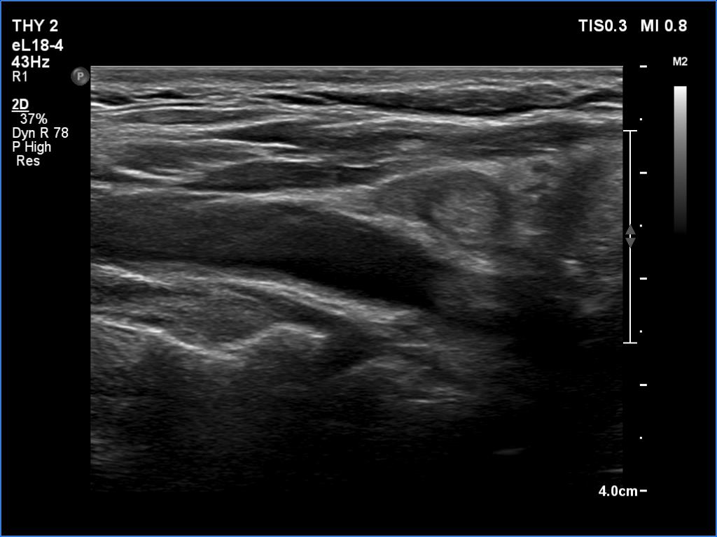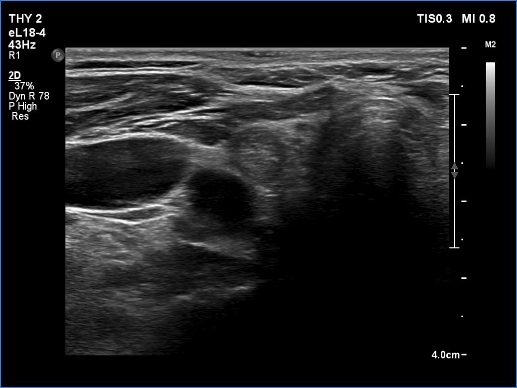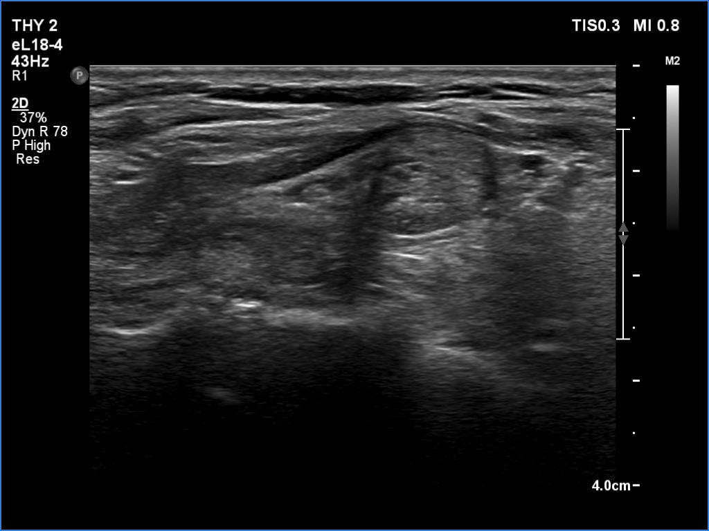 Ultrasonography. Both lobes had discrete lesions. The volume of the lobes were approximately one-tenth and one-third of a normal lobe, right and left lobe, respectively. The possibility of a true nodule should be considered in the event of the lesions in the left lobe.