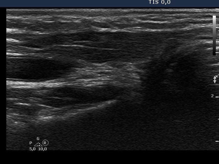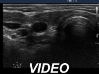 Ultrasonography. There was no parenchyma according to the thyroid lobes. Connective tissue and muscle fiber have replaced the thyroid tissue, dorsal and ventral part, respectively.