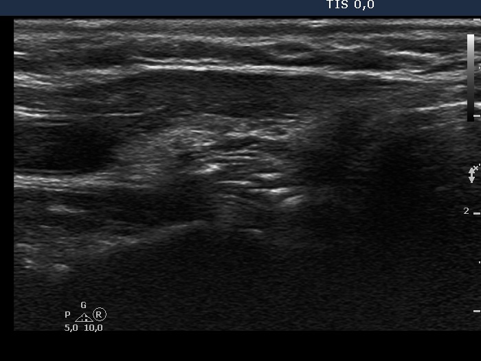 Clinical data: A 41-year-old woman was referred for follow-up examination. She underwent total thyroidectomy and radioiodine therapy for 5 years because of papillary carcinoma. She had no complaints.