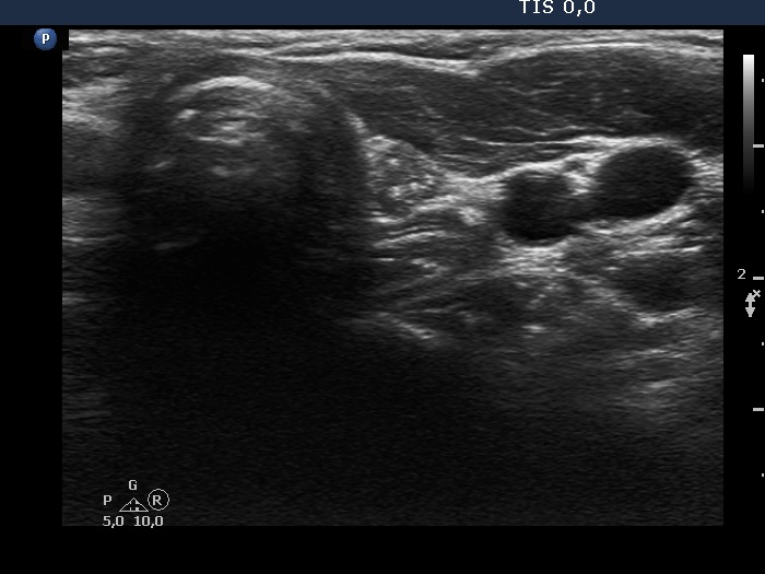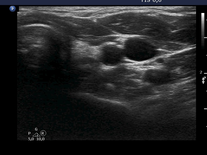 Clinical data: A 39-year-old woman was referred for a routine follow-up ultrasound examination. She has been operated on a T1b papillary cancer for 7 years. I met her first 5 years ago when I found a small, suspicious focus of 6x5x7 mm in the left lobe bed. Cytology did not indicate malignancy, only connective tissue cells were on the smear. Two years later, the size of the lesion did not change, no cytology was performed. Thyroglobulin levels have fluctuated between 0.26 and 0.43 ng/mL in the first six years after surgery - with no detectable trend.